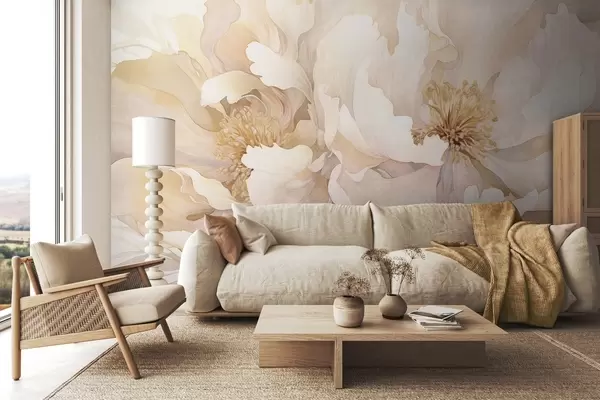 Fototapeten Blumen mit Pfingstrosenstruktur und zarten Blütenblättern in cremefarbenen Pfirsich- und hellrosa Tönen mit einer weichen, aquarellartigen Textur N° w09321