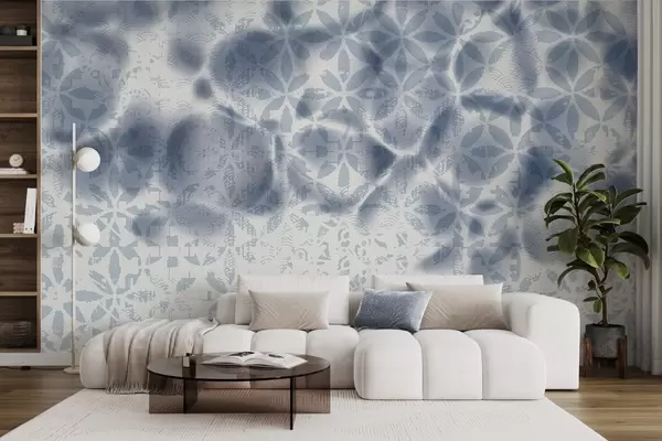 Fototapeten Abstraktes, strukturiertes Kunstwerk mit blauem Blumendruck, verblasst und verschwommen, was eine weiche und verträumte Atmosphäre schafft N° w09322