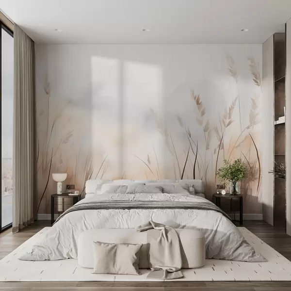 Fototapeten Getreideähren in Nebel in sanften Beige- und Brauntönen N° w09327