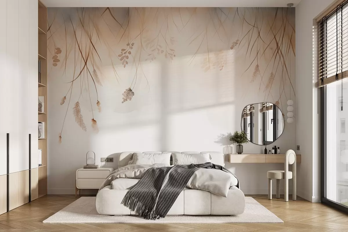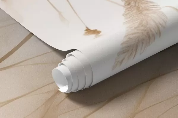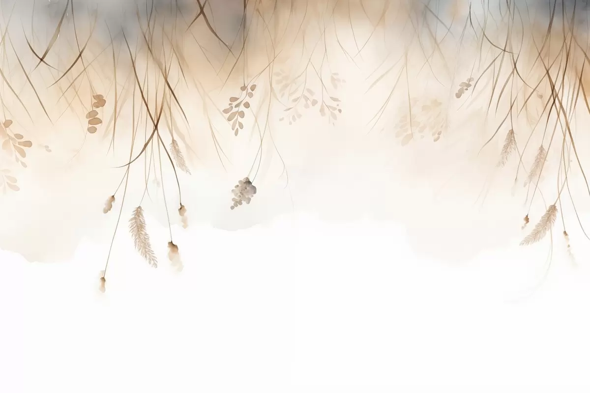 Fototapeten Hängende Rohrkolben und Getreideähren im Nebel in sanften Beige- und Brauntönen N° w09328