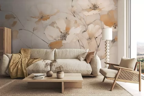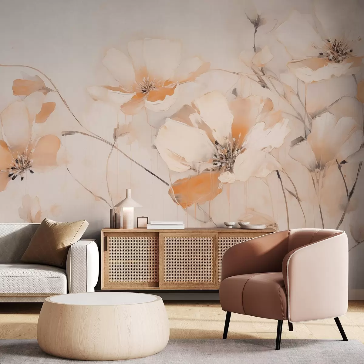 Fototapeten Weiße und orangefarbene strukturierte Blumen mit langen Stielen, heller Hintergrund, weiche Farben, elegante Komposition, zarte Pinselstriche N° w09335