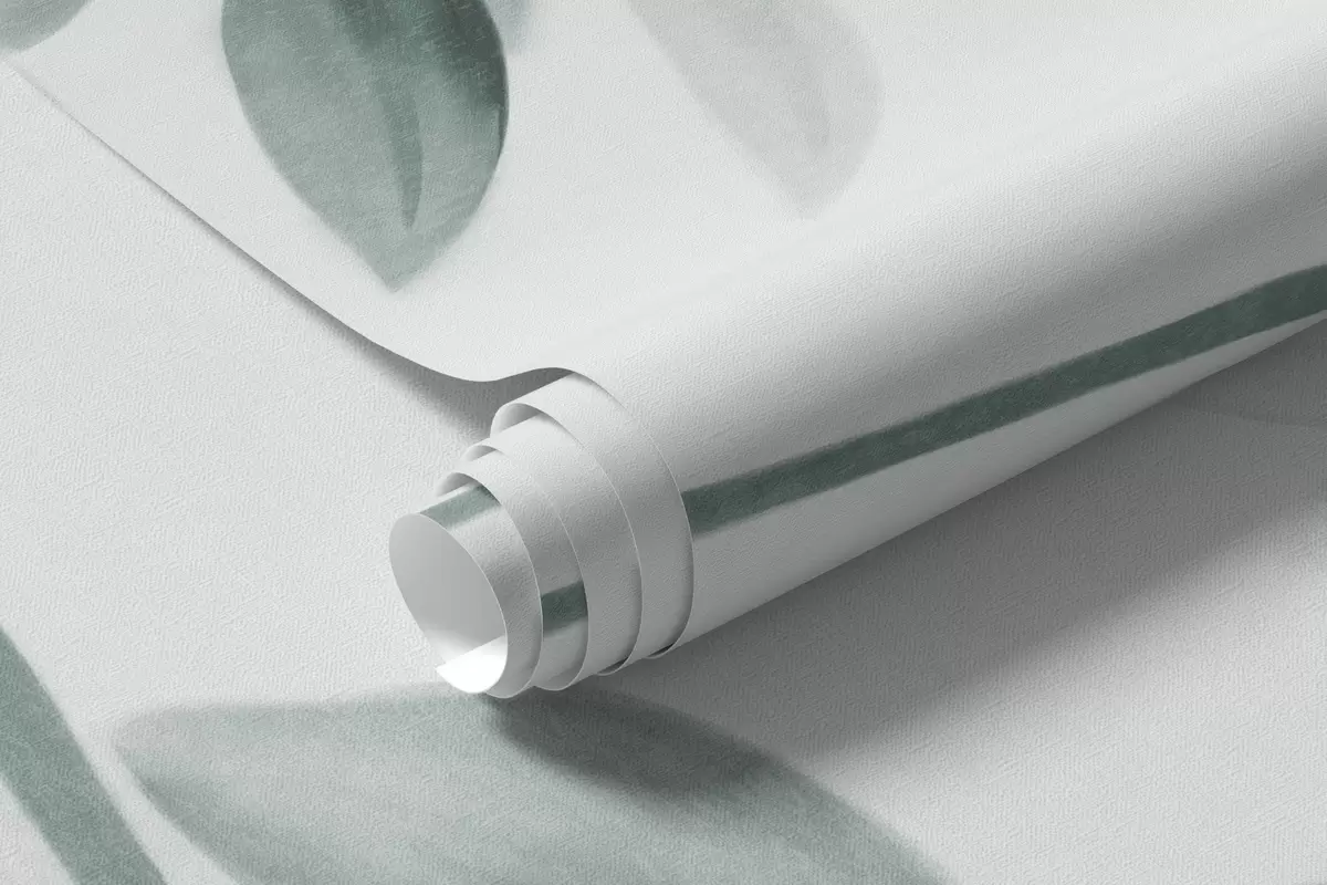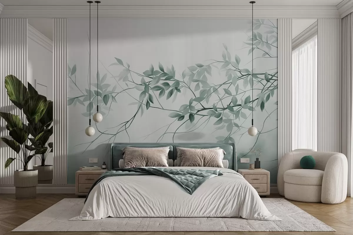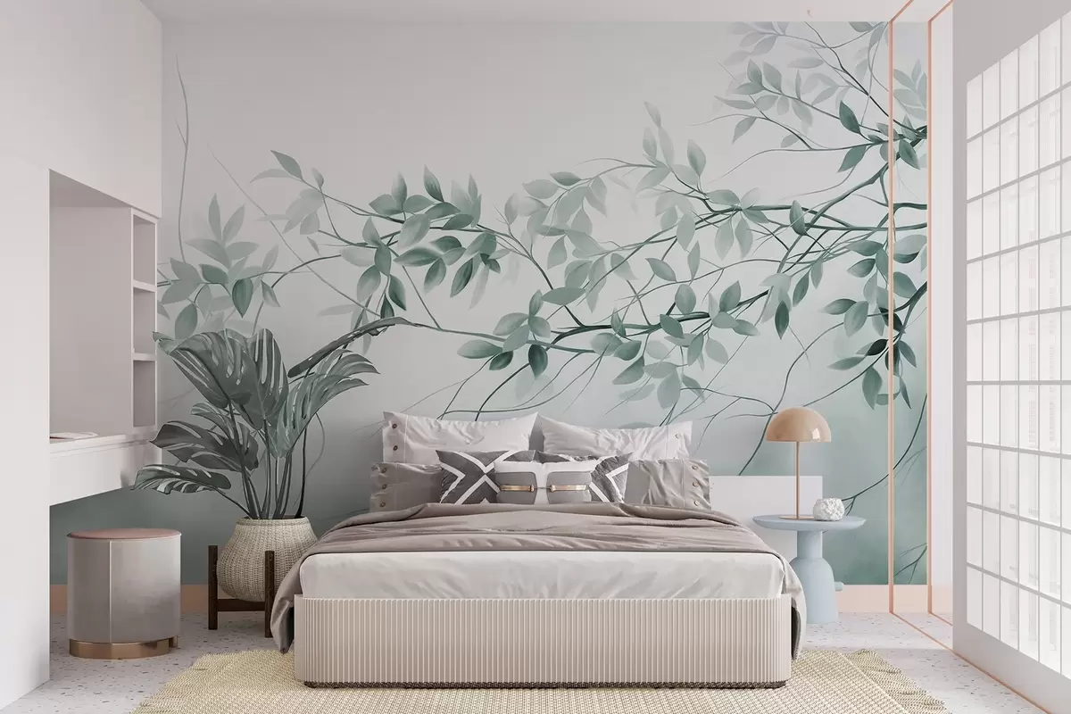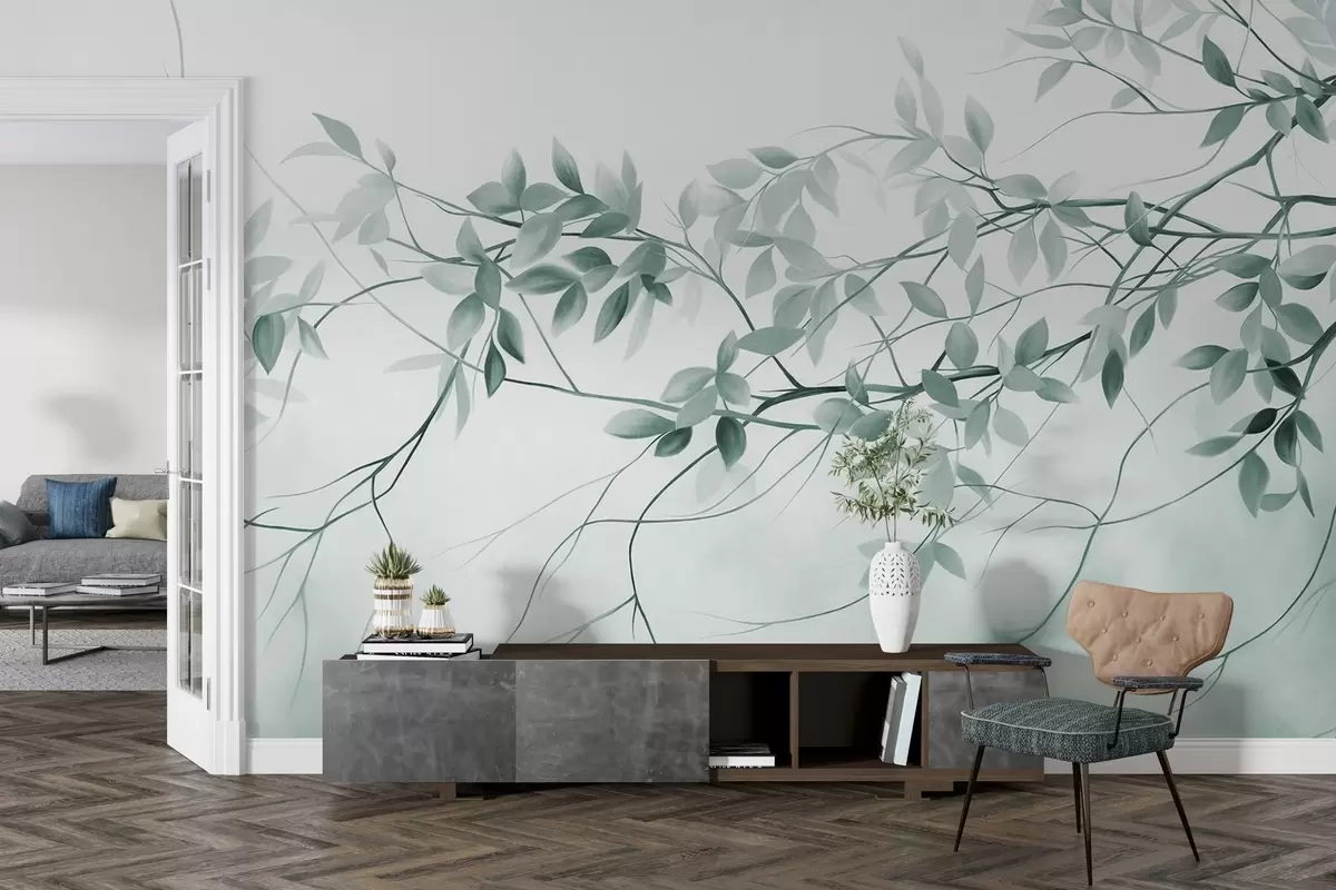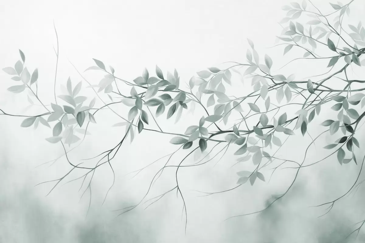 Fototapeten Zarte, strukturierte Zweige mit gedeckten grauen und grünen Blättern vor einem weichen, verschwommenen Hintergrund N° w09336v1