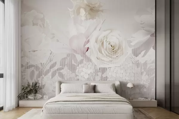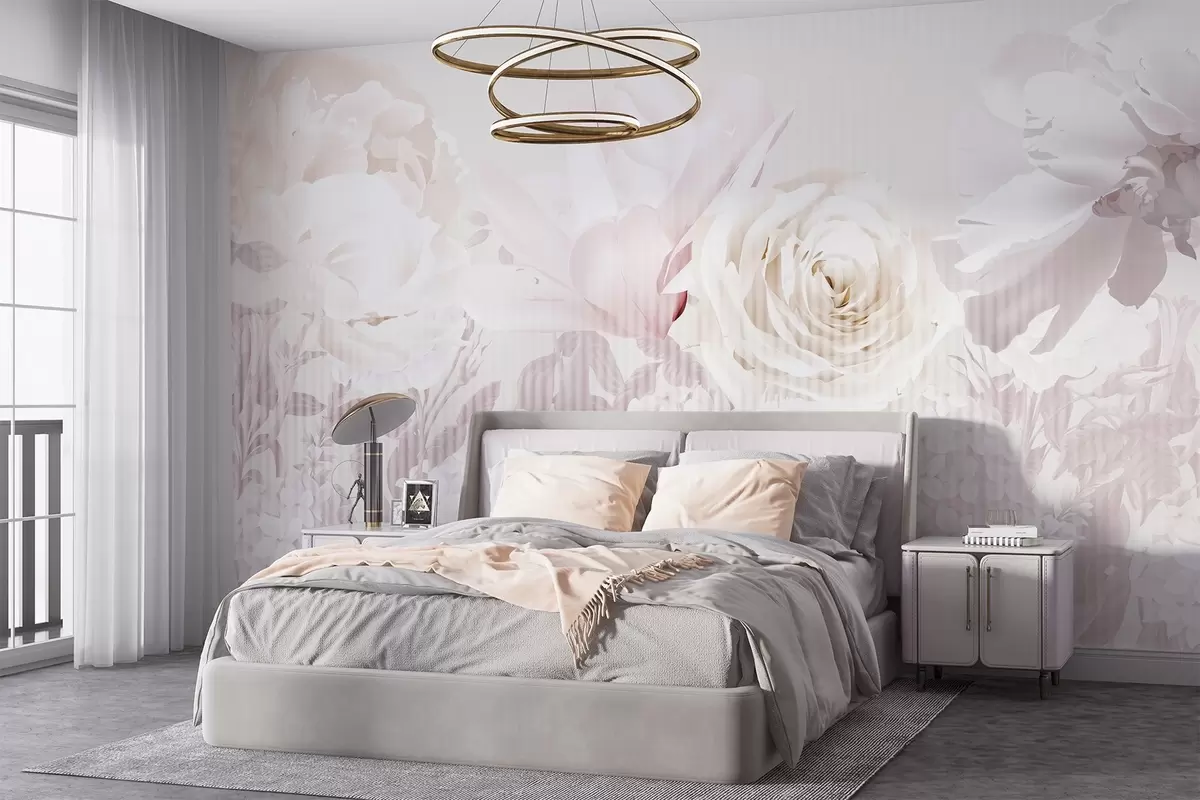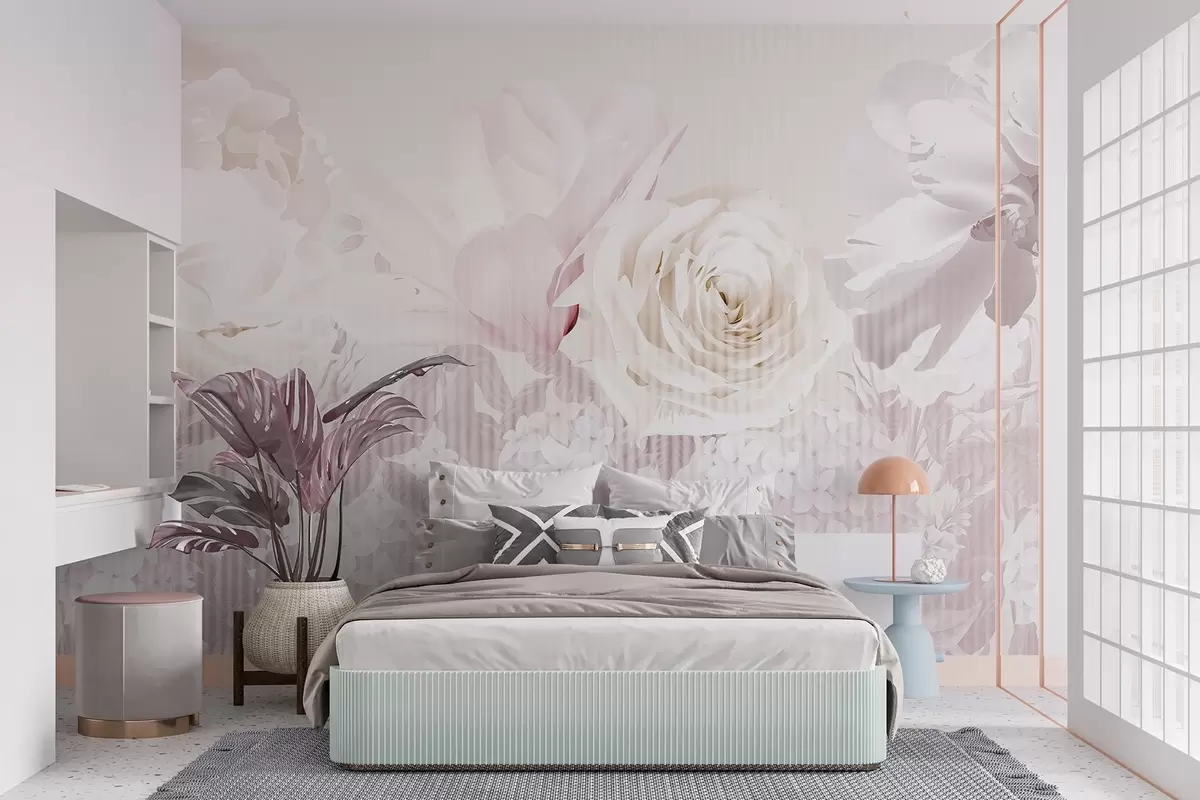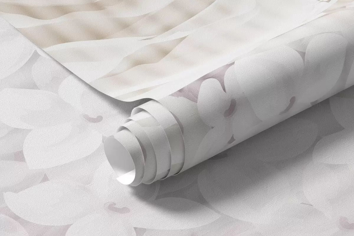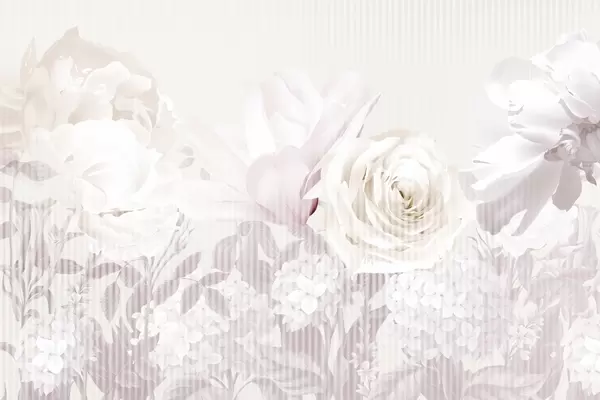Fototapeten Blumenarrangement mit Rosen, Hortensien und Tulpen in sanften Pastelltönen von Weiß, Rosa und Beige, mit gestreifter Struktur N° w09340
