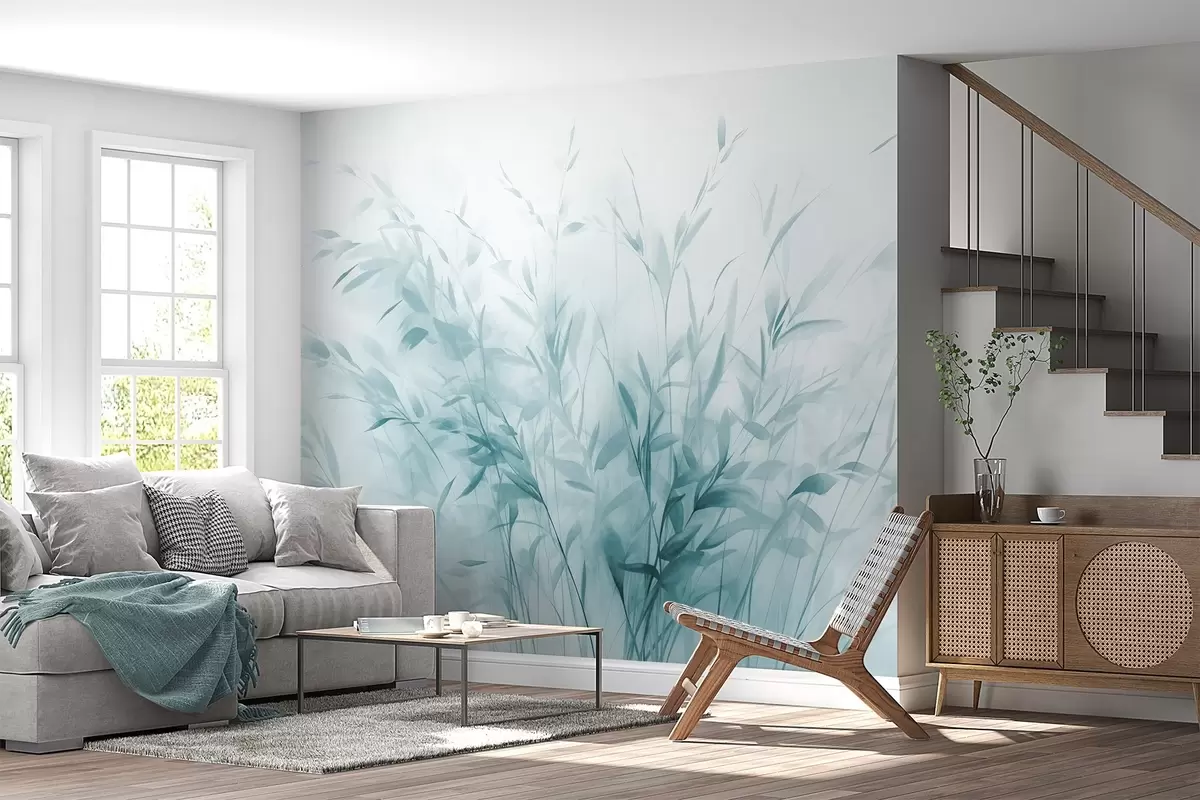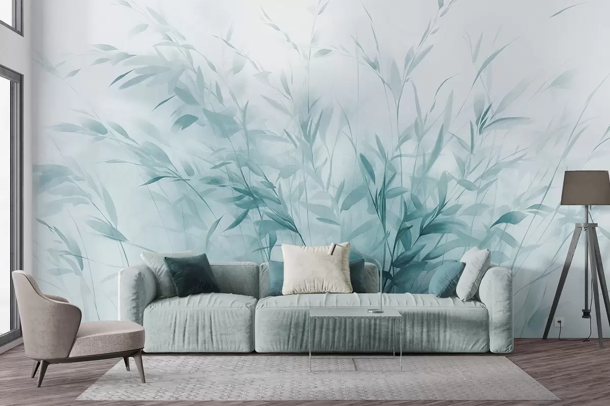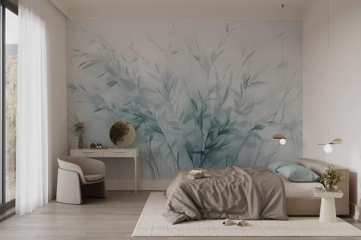 Fototapeten Gras und Unkraut mit dünnen Blättern und Stängeln, hellblaue Farben, weiche und zarte Pinselstriche, minimalistischer Druck N° w09342v1