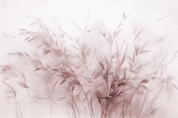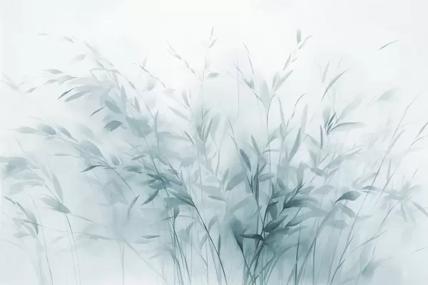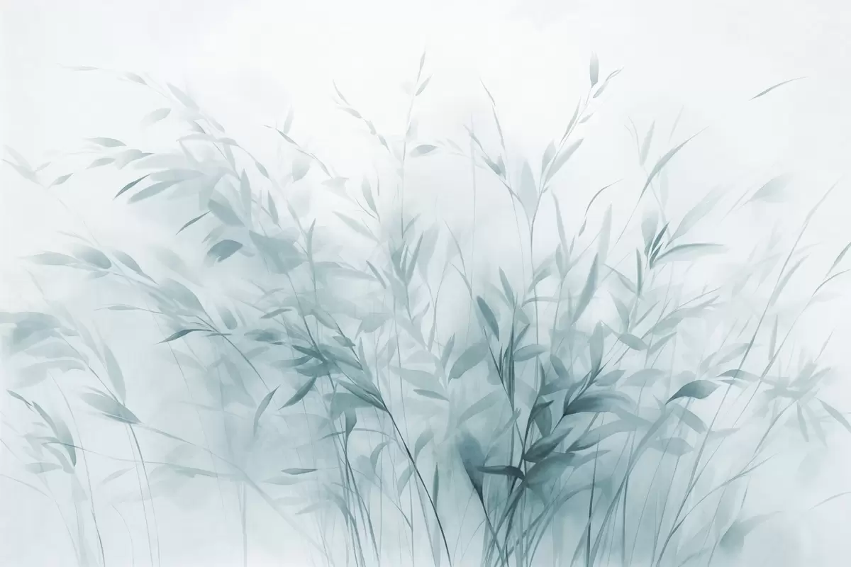Fototapeten Gras und Unkraut mit dünnen Blättern und Stängeln, hellblaue Farben, weiche und zarte Pinselstriche, minimalistischer Druck N° w09342v1