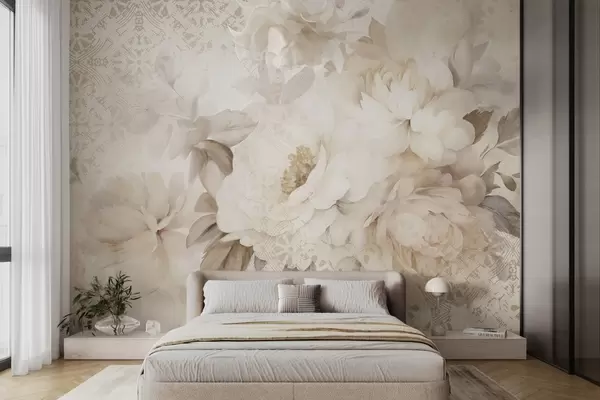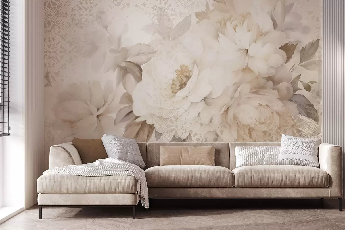 Fototapeten Ein Blumenarrangement aus weißen Pfingstrosen mit beigen Blättern vor einem dekorativen Hintergrund mit einer Vintage-Struktur N° w09345