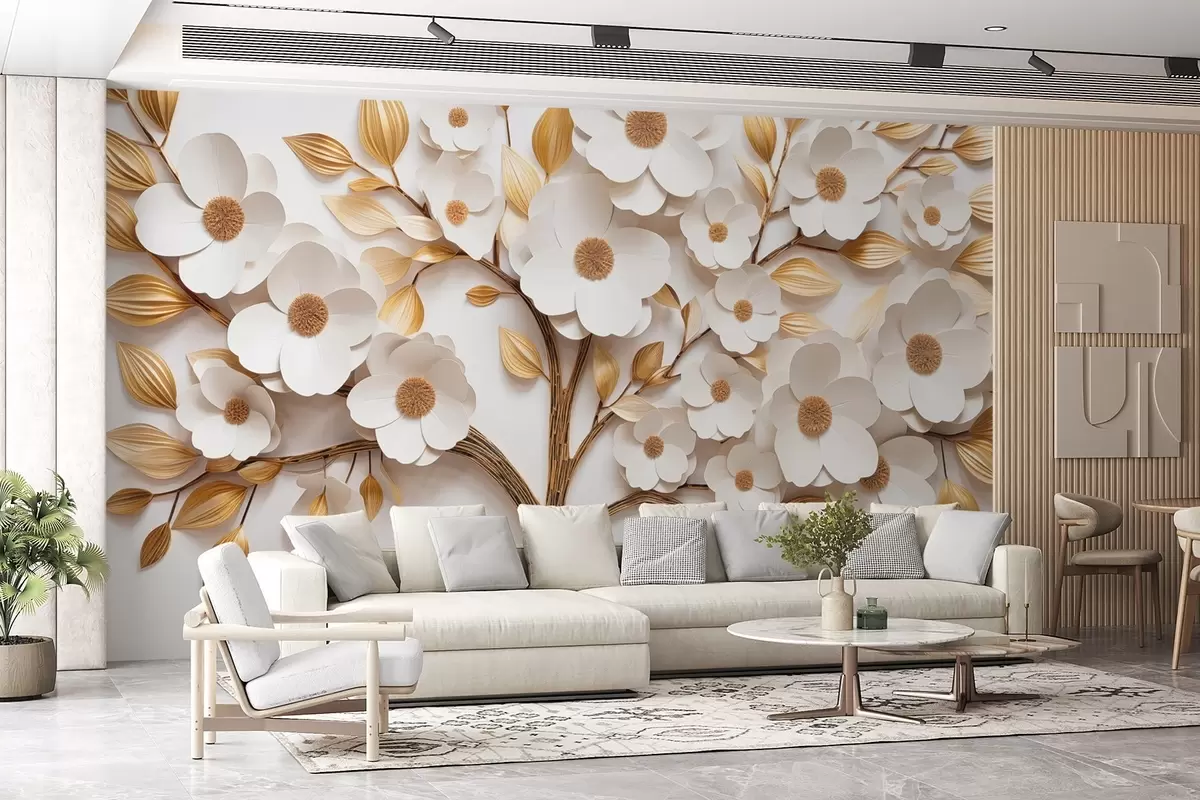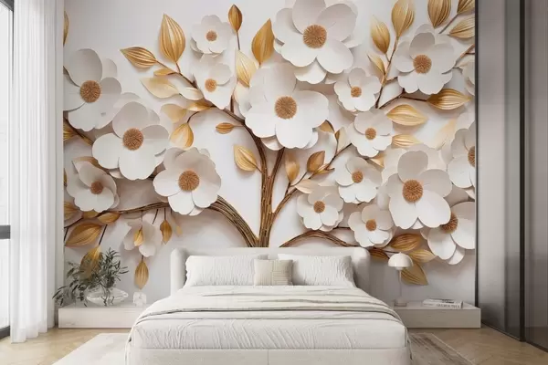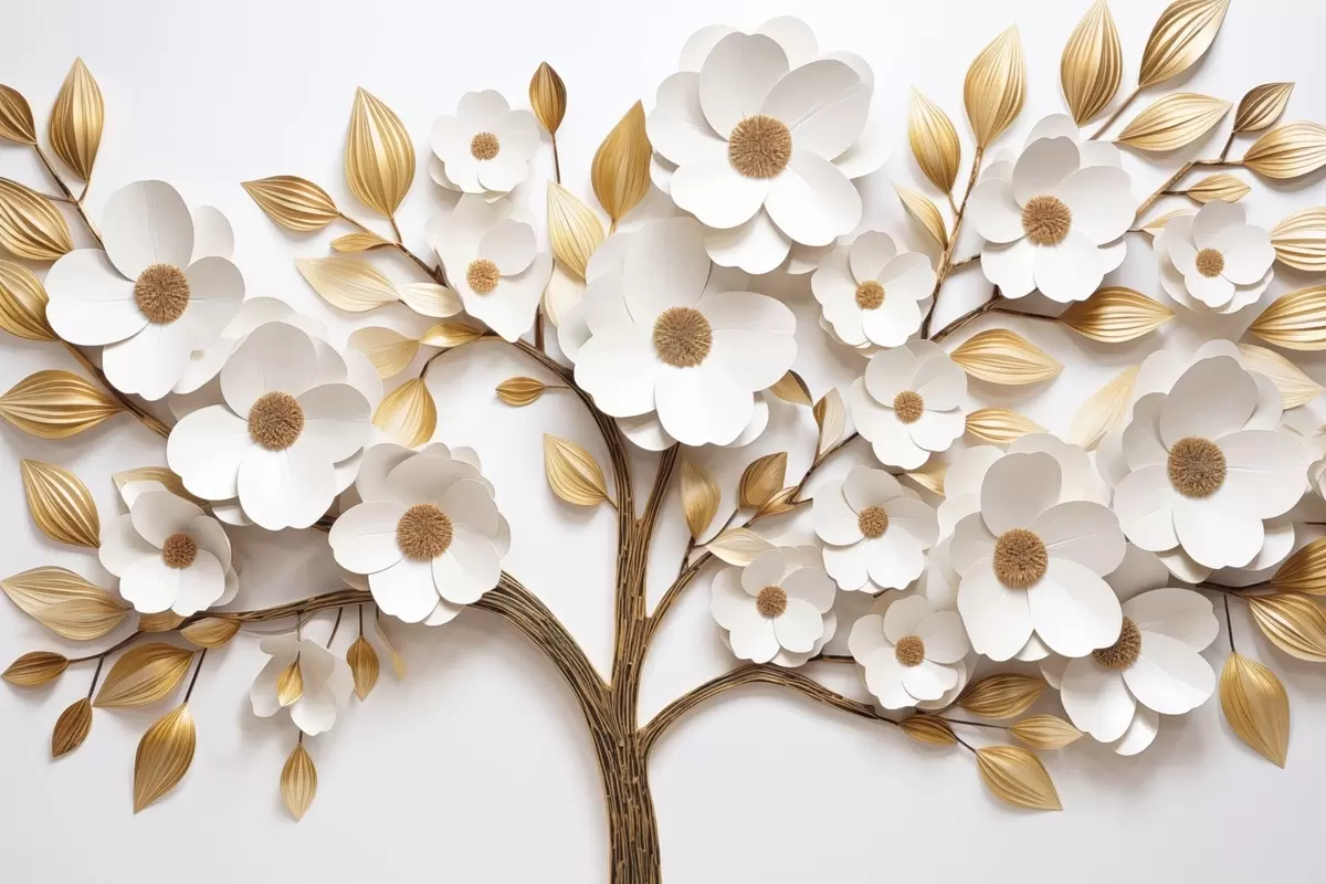 Fototapeten Baum mit weißen Blüten und Nachahmung von Reliefblättern N° w09348