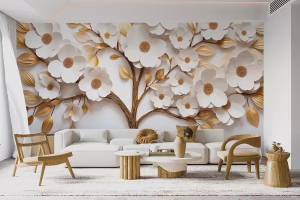 Fototapeten Baum mit weißen Blüten und Nachahmung von Reliefblättern N° w09348