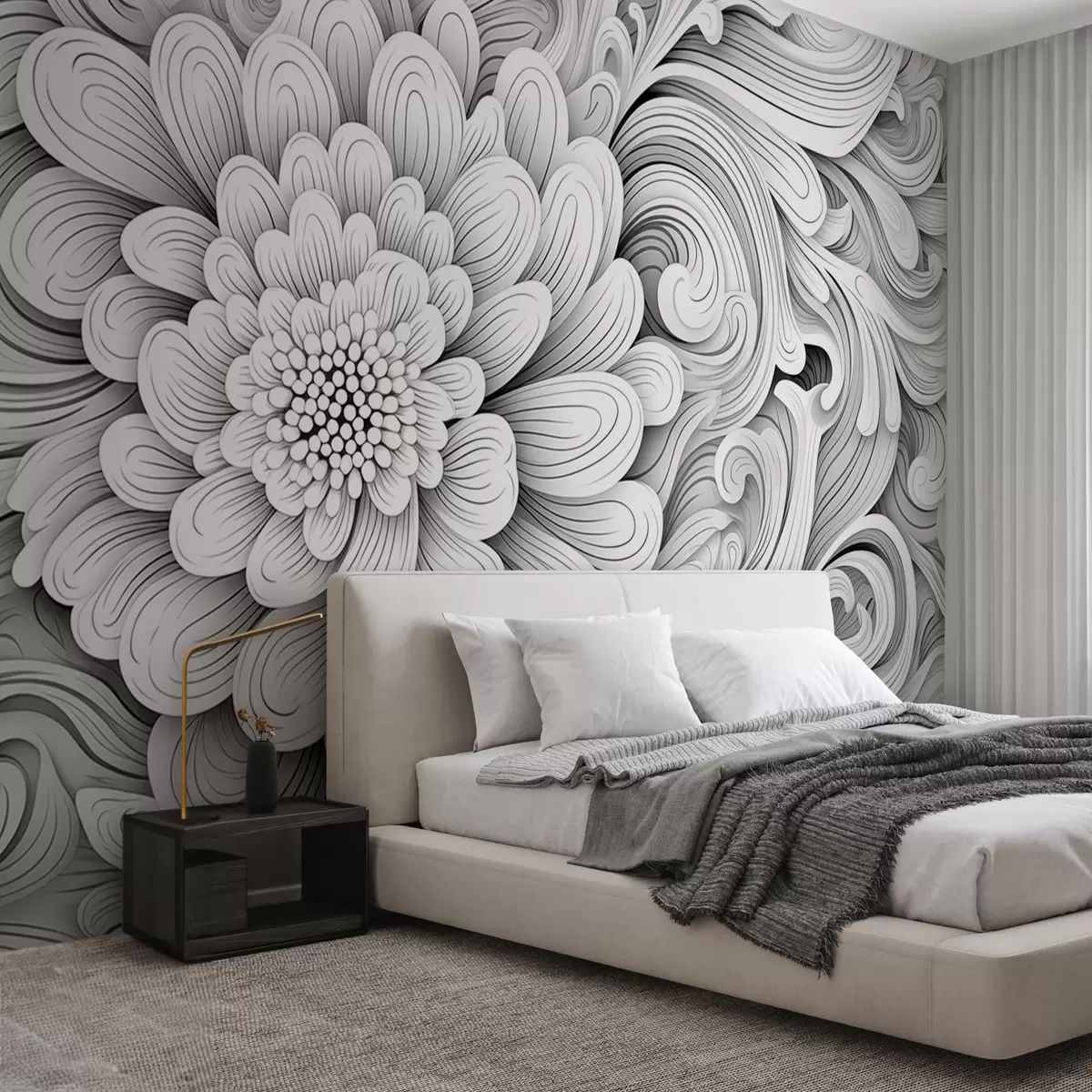 Fototapeten Dekoratives schwarz-weißes Muster in Form einer Blume und von Wirbeln N° w09355