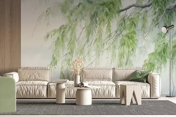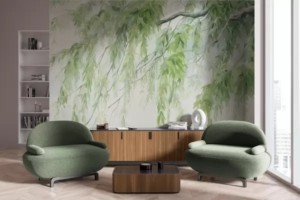 Fototapeten Trauerweidenzweige mit herabhängenden grünen Blättern, weiche und zarte Pinselstriche, Aquarellmalstil N° w09365