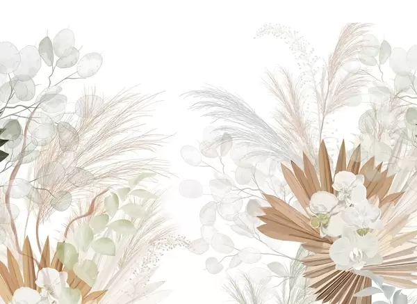 Fototapeten Pampasgras, Eukalyptus, tropische Blätter und Orchideen vor weißem Hintergrund, Pastellfarben N° w09366