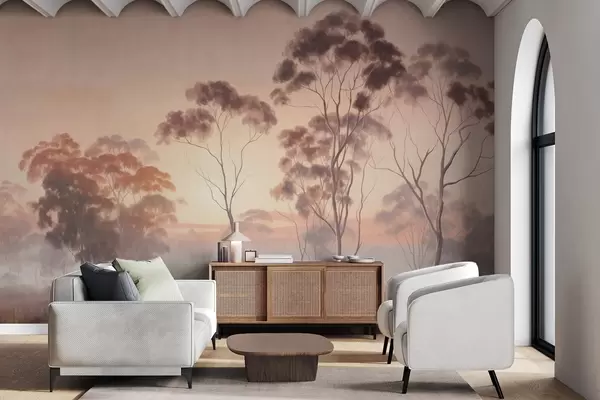 Fototapete Eine Landschaft mit Eukalyptusbäumen in einem Feld mit Pastell rosa und orange Himmel, ein leichter Nebel, Malerei texturierten Stil w09367