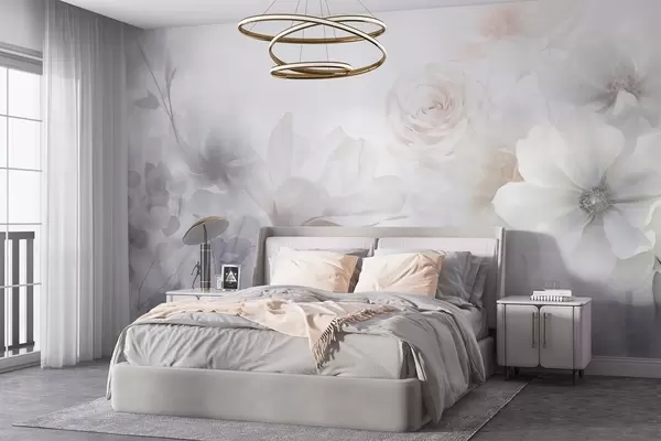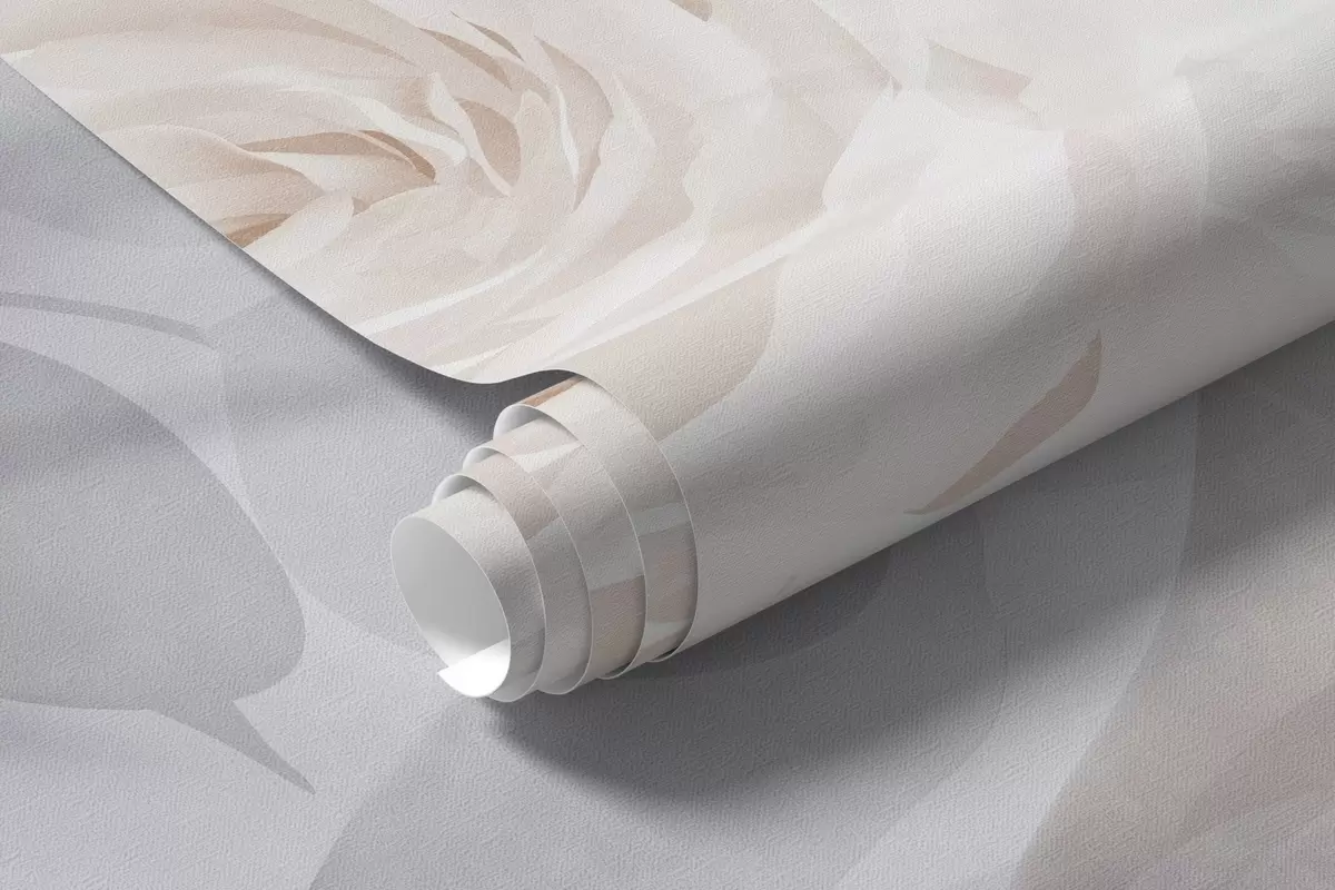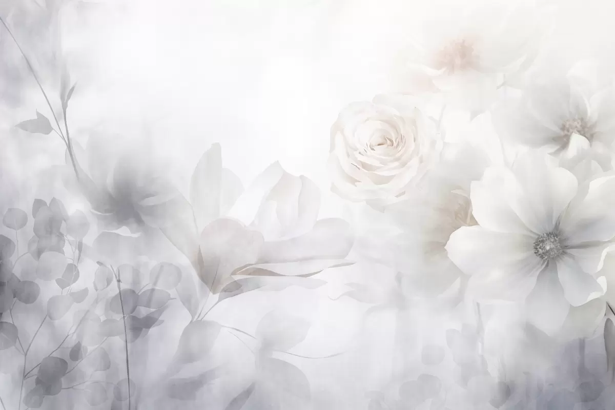 Fototapeten Ein zartes abstraktes Blumenarrangement mit pastellrosa Rosen und Magnolien, Weichzeichner, hellgrauer Hintergrund N° w09371