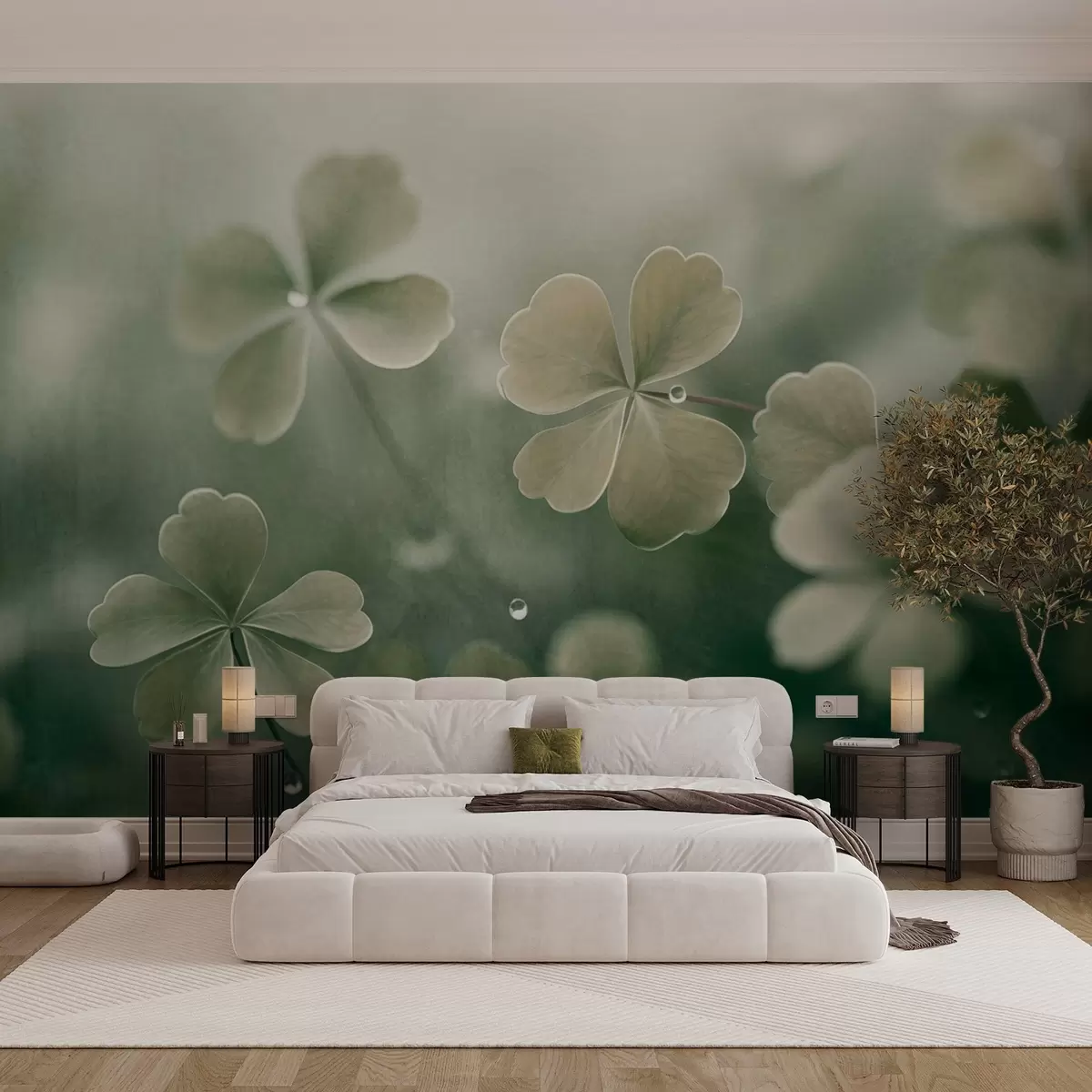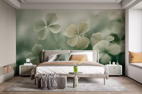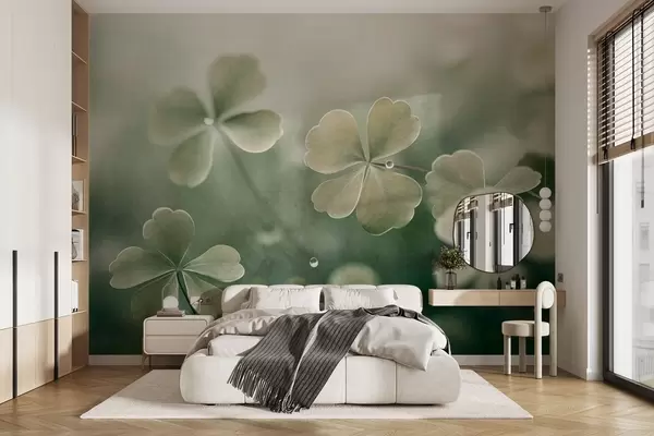 Fototapeten Vierblättrige Kleeblätter mit Wassertropfen, hellgrüne Farbe, weicher Fokus, unscharfer Hintergrund, strukturierter Druck N° w09376