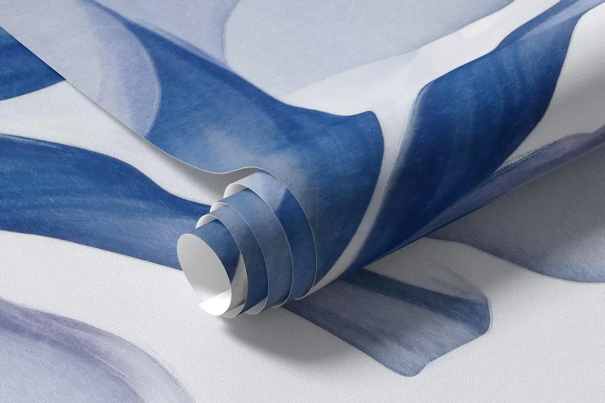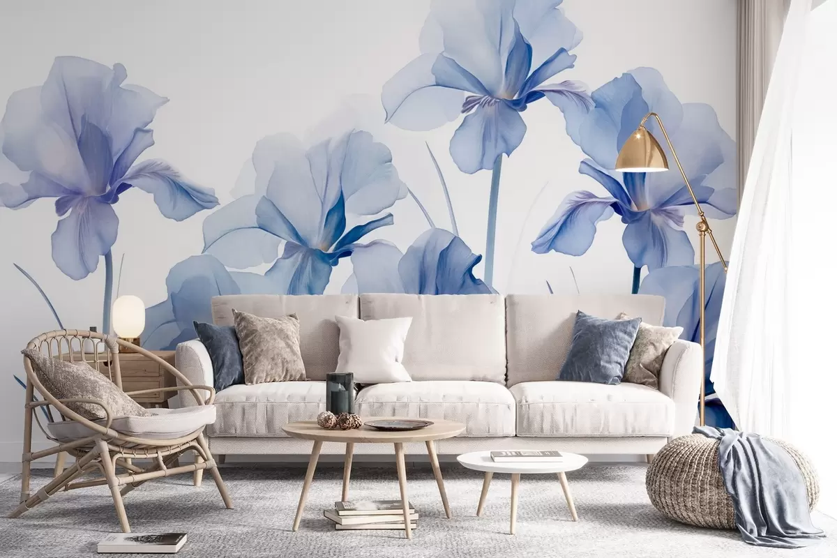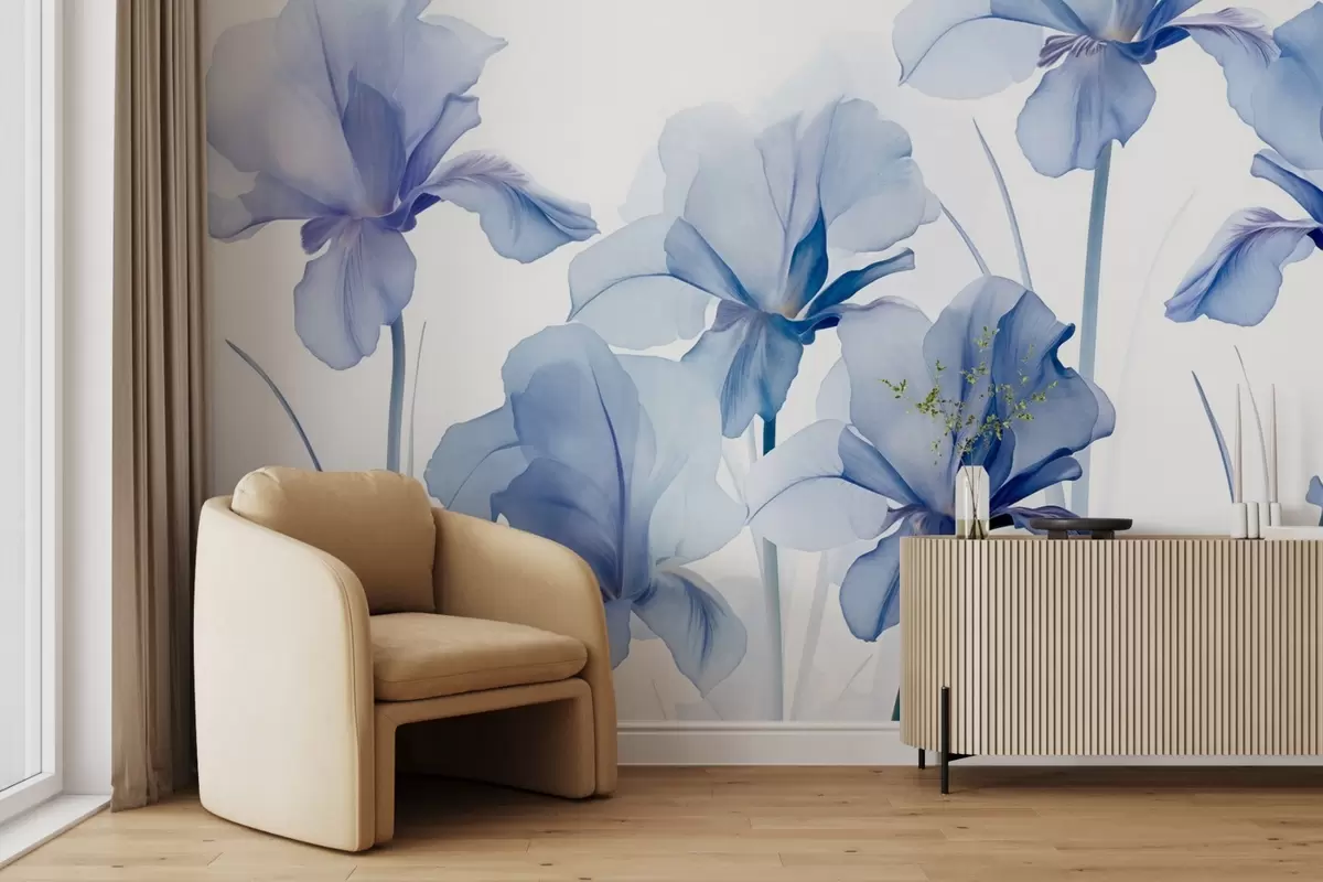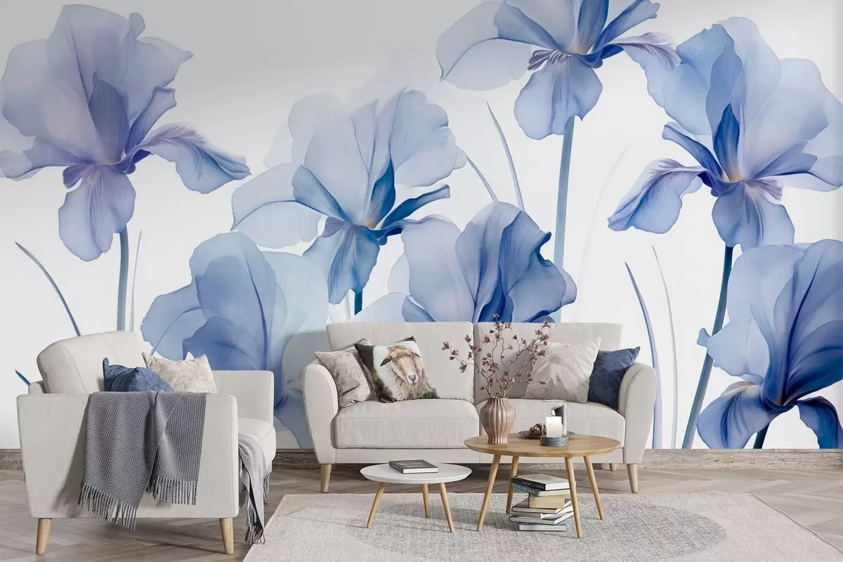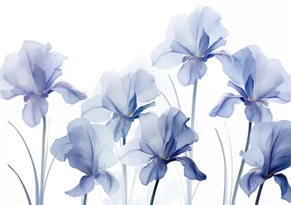 Fototapeten Blaue Irisblüten mit durchscheinenden Blütenblättern und langen Stielen, in einer Reihe vor einem blauen Hintergrund angeordnet, weich und strukturiert N° w09379