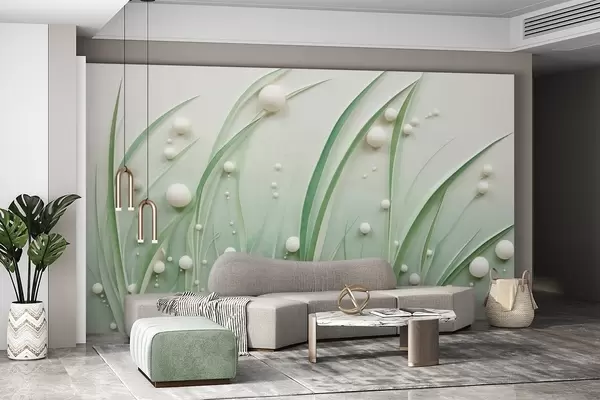 Fototapeten Abstraktes grünes Gras mit weißen Kugeln, hellgrüner Hintergrund, strukturiert, klare Linien, minimalistischer Stil N° w09382