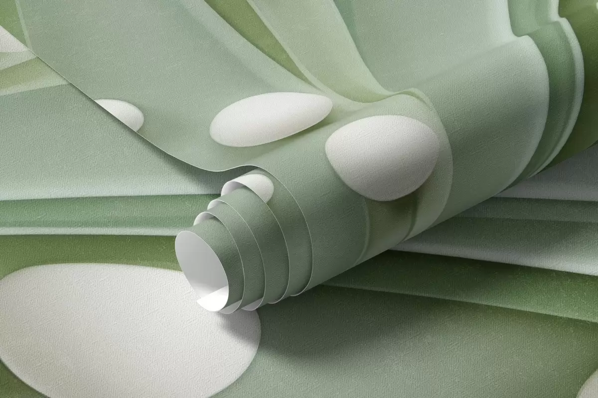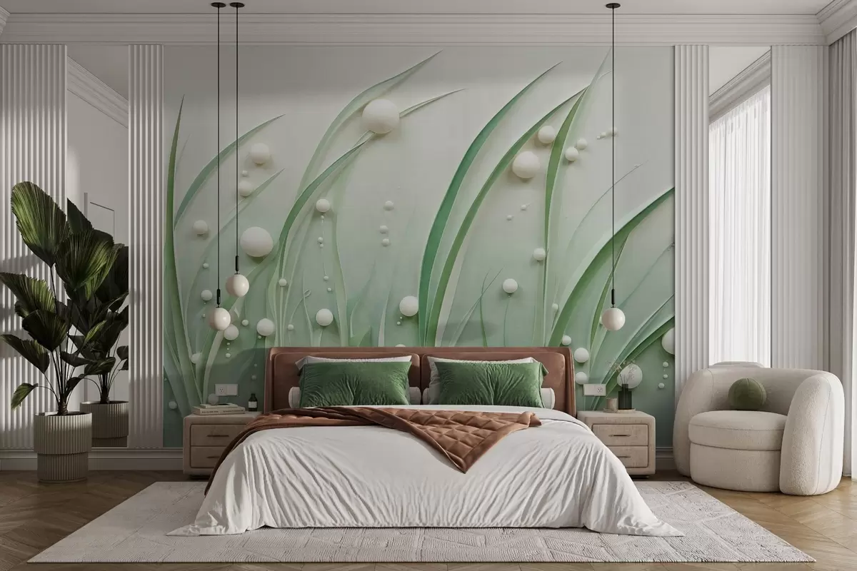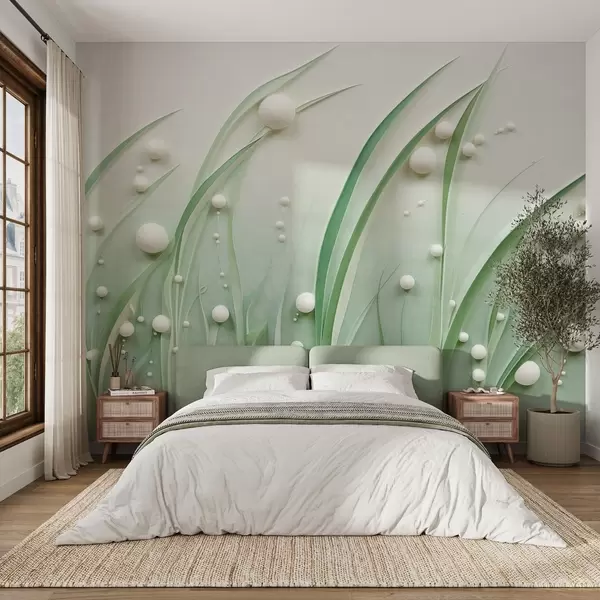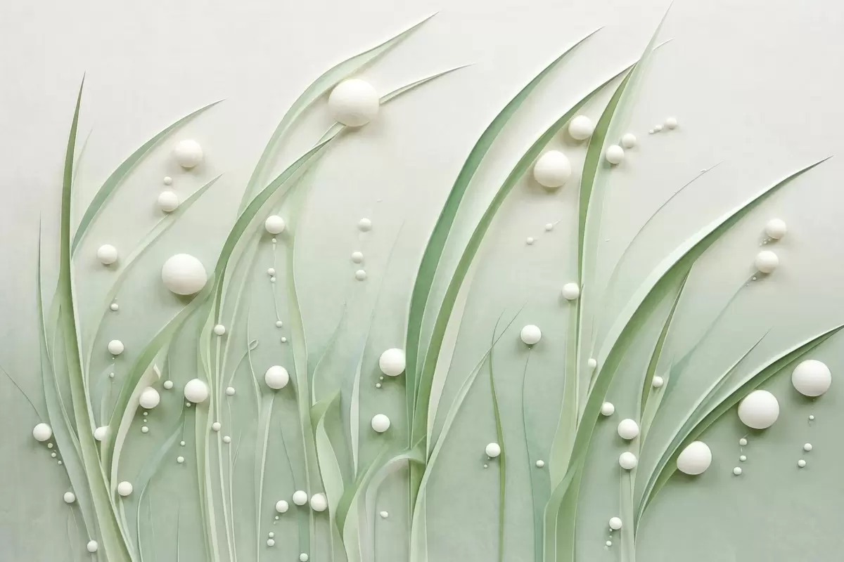 Fototapeten Abstraktes grünes Gras mit weißen Kugeln, hellgrüner Hintergrund, strukturiert, klare Linien, minimalistischer Stil N° w09382