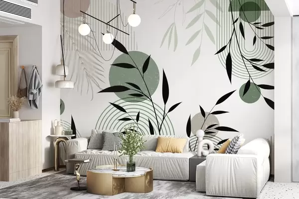 Fototapeten Abstrakter Strukturdruck mit geometrischen Formen, Kreisen und Bögen sowie schwarzen und grünen Pflanzen auf weißem Hintergrund N° w09384