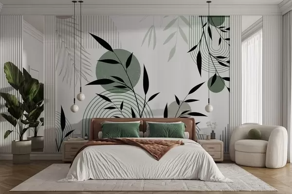 Fototapete Abstrakter Strukturdruck mit geometrischen Formen, Kreisen und Bögen sowie schwarzen und grünen Pflanzen auf weißem Hintergrund w09384