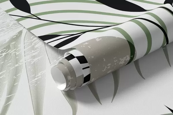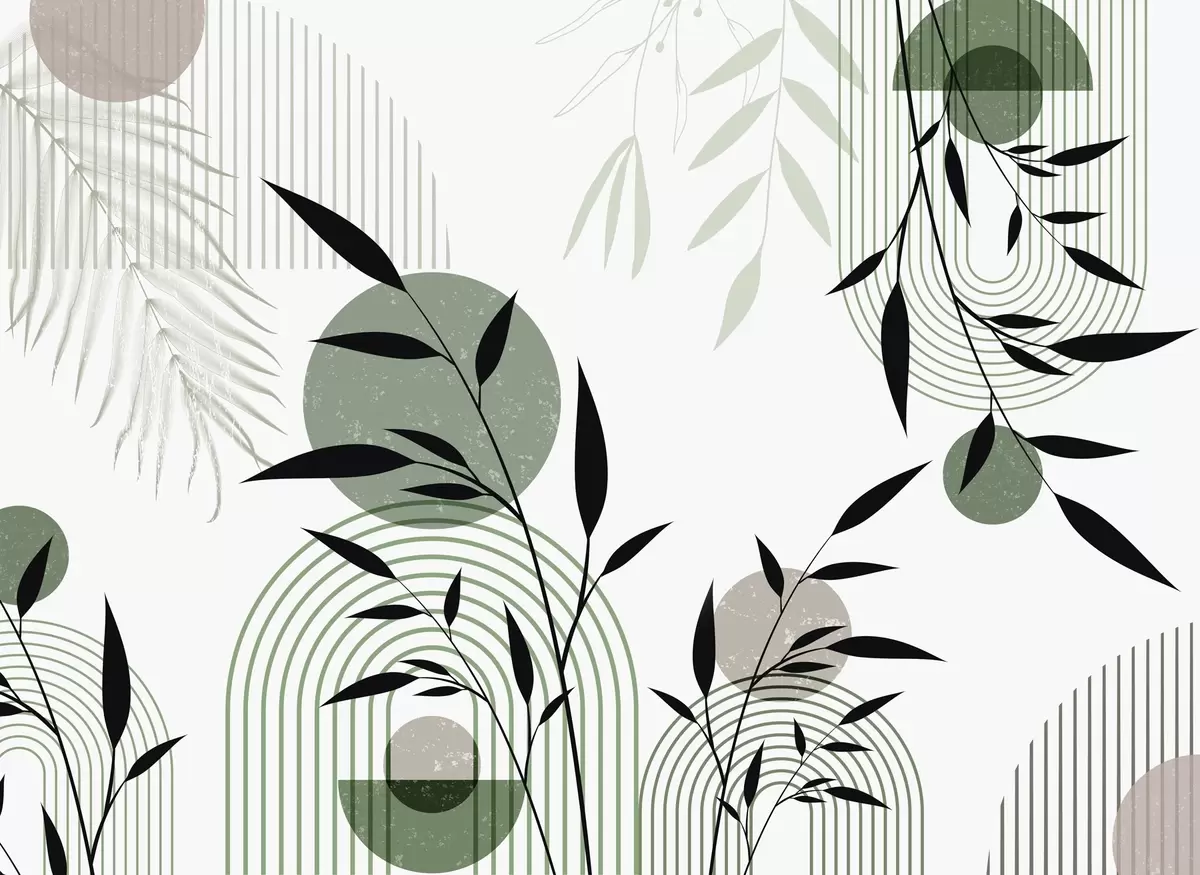 Fototapeten Abstrakter Strukturdruck mit geometrischen Formen, Kreisen und Bögen sowie schwarzen und grünen Pflanzen auf weißem Hintergrund N° w09384