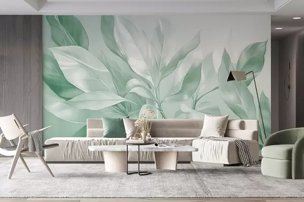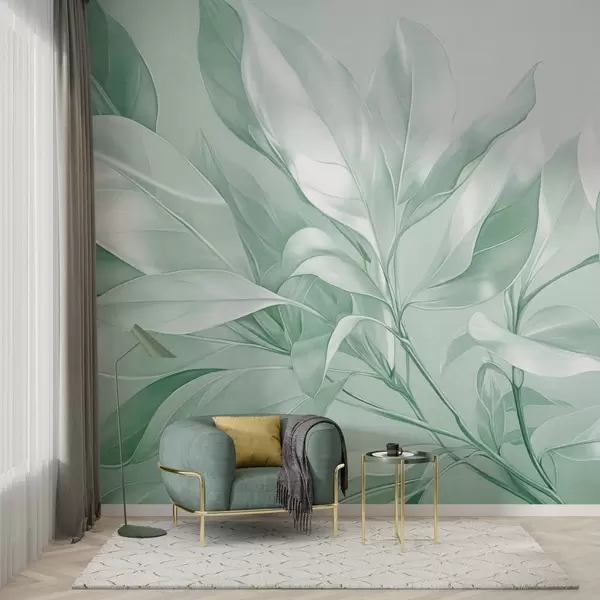 Fototapeten Magnolienblätter mit weißen und grünen Farbtönen, weiche Beleuchtung, elegante Komposition, detaillierte Blattadern, künstlerische Pinselstriche N° w09385v1