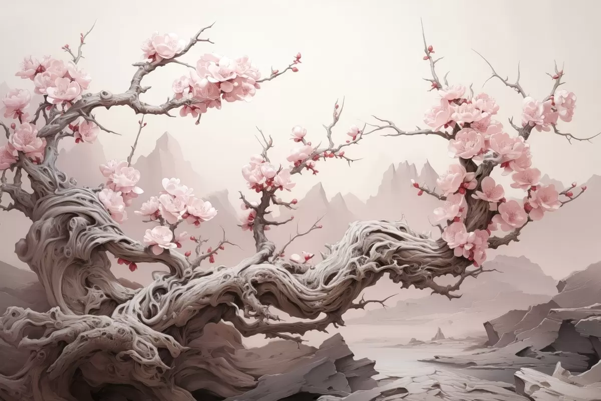 Fototapeten Verdrehter Baumstamm mit blühendem rosa Sakura N° w09388
