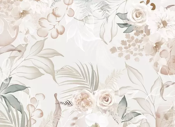 Fototapeten Blumenarrangement mit Rosen, Orchideen, Eukalyptus und Palmblättern in Pastellfarben, beigefarbenem Hintergrund N° w09393