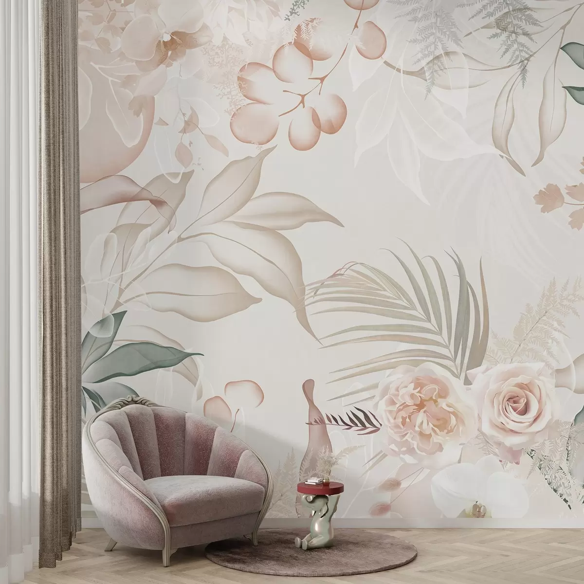 Fototapeten Blumenarrangement mit Rosen, Orchideen, Eukalyptus und Palmblättern in Pastellfarben, beigefarbenem Hintergrund N° w09393