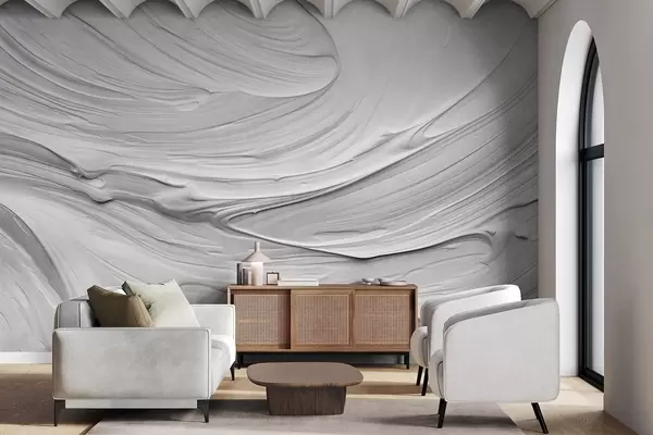 Fototapeten Abstrakte, strukturierte weiße Farbstriche in Anlehnung an ein wirbelndes Muster, neutrale, minimalistische, moderne Komposition N° w09394