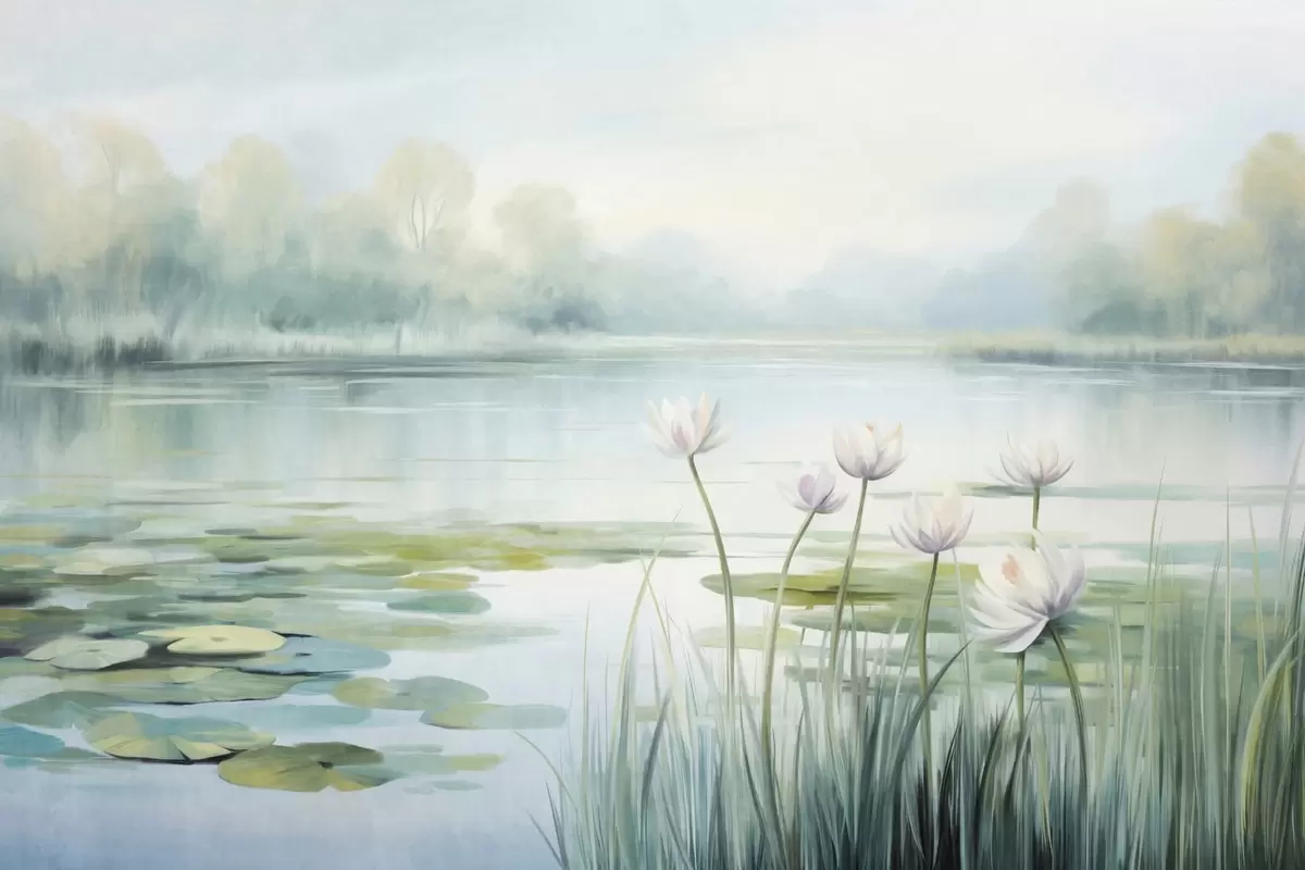 Fototapeten Landschaft mit einem See, Seerosen und Seerosenblättern, Bäumen im Hintergrund, in einer ruhigen Umgebung, hellblauen und grünen Farbtönen N° w09395