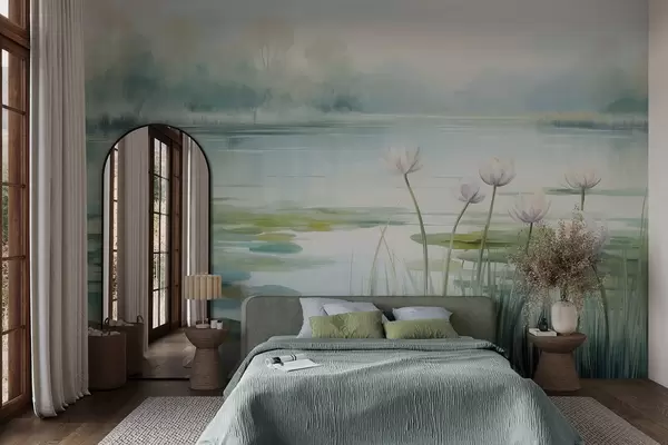 Fototapeten Landschaft mit einem See, Seerosen und Seerosenblättern, Bäumen im Hintergrund, in einer ruhigen Umgebung, hellblauen und grünen Farbtönen N° w09395