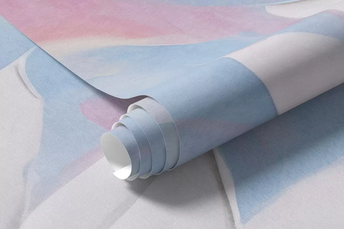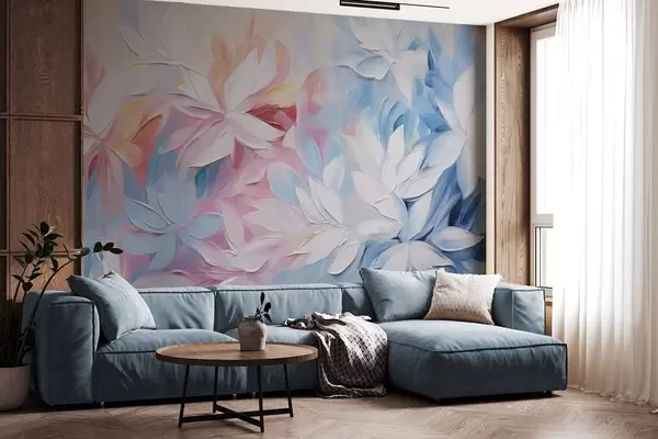 Fototapeten Weiße strukturierte Blumen mit rosa und blauen Blättern, Ölgemälde im abstrakten Stil, weiche Pinselstriche, Pastellfarben N° w09396
