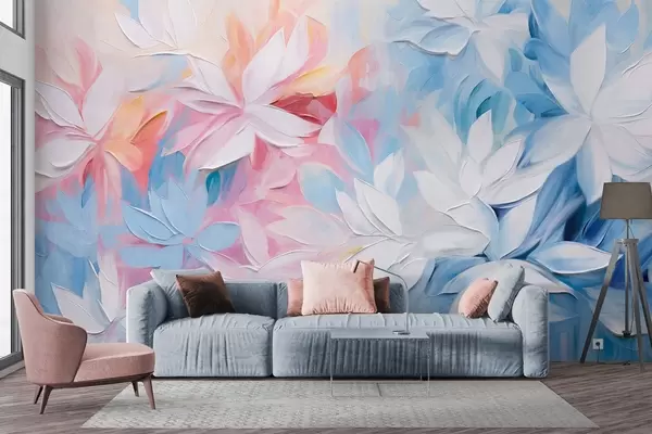 Fototapeten Weiße strukturierte Blumen mit rosa und blauen Blättern, Ölgemälde im abstrakten Stil, weiche Pinselstriche, Pastellfarben N° w09396