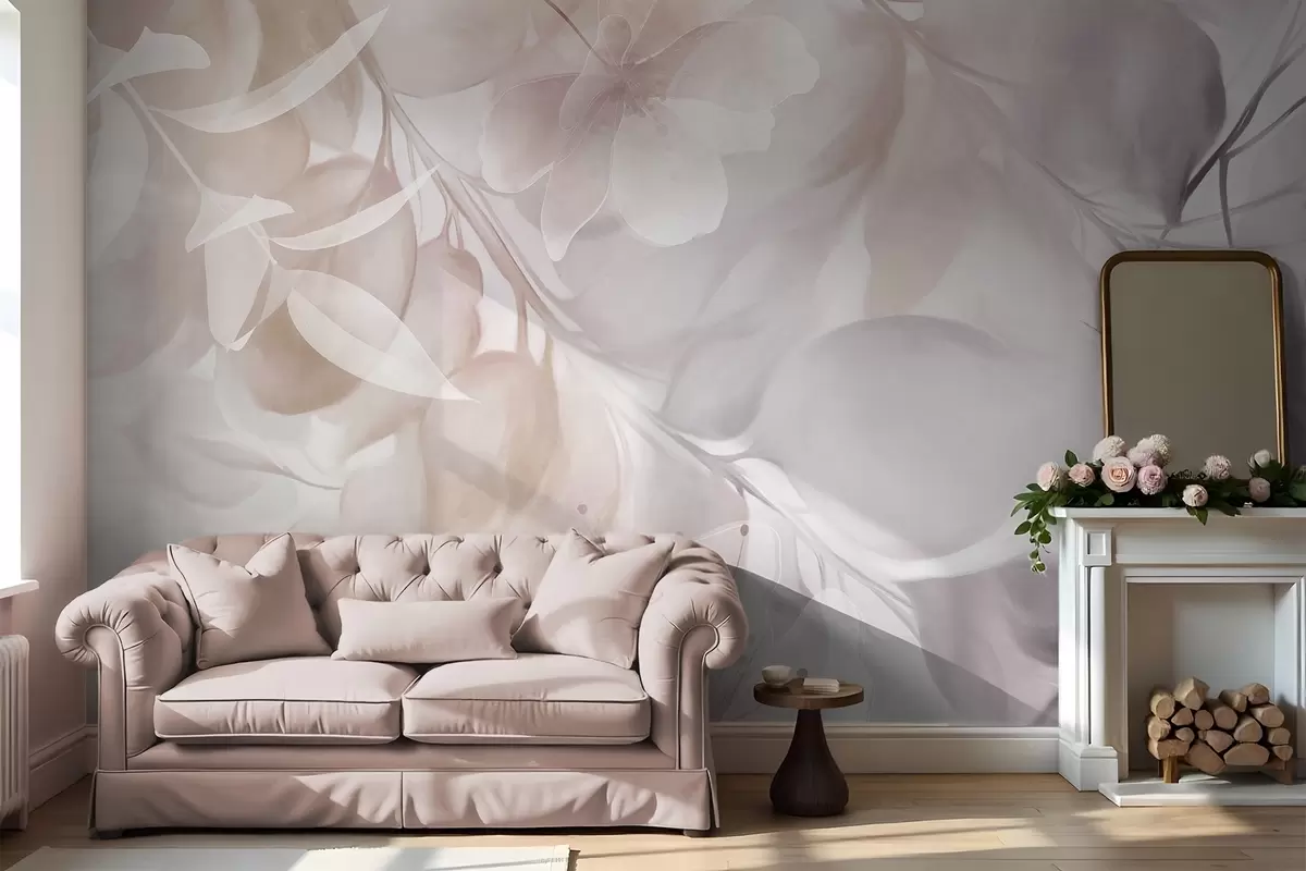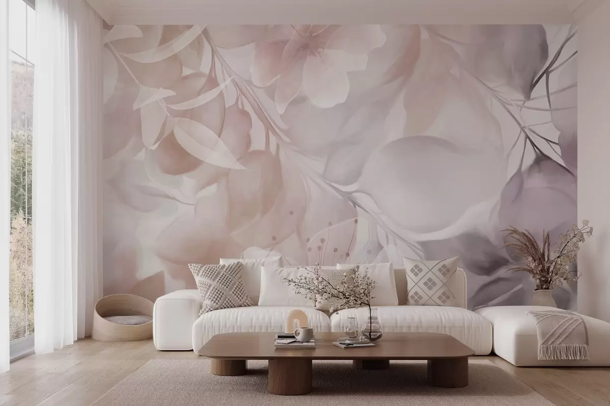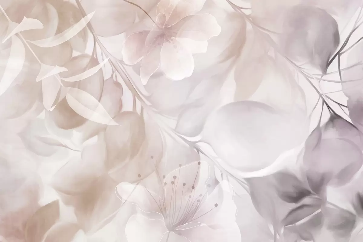 Fototapeten Blumenkunst mit gedeckten beige- und braunen Blumen, Blättern und Zweigen, sanften Pastellfarben und Aquarell-Struktureffekt N° w09397