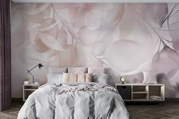 Fototapeten Blumenkunst mit gedeckten beige- und braunen Blumen, Blättern und Zweigen, sanften Pastellfarben und Aquarell-Struktureffekt N° w09397