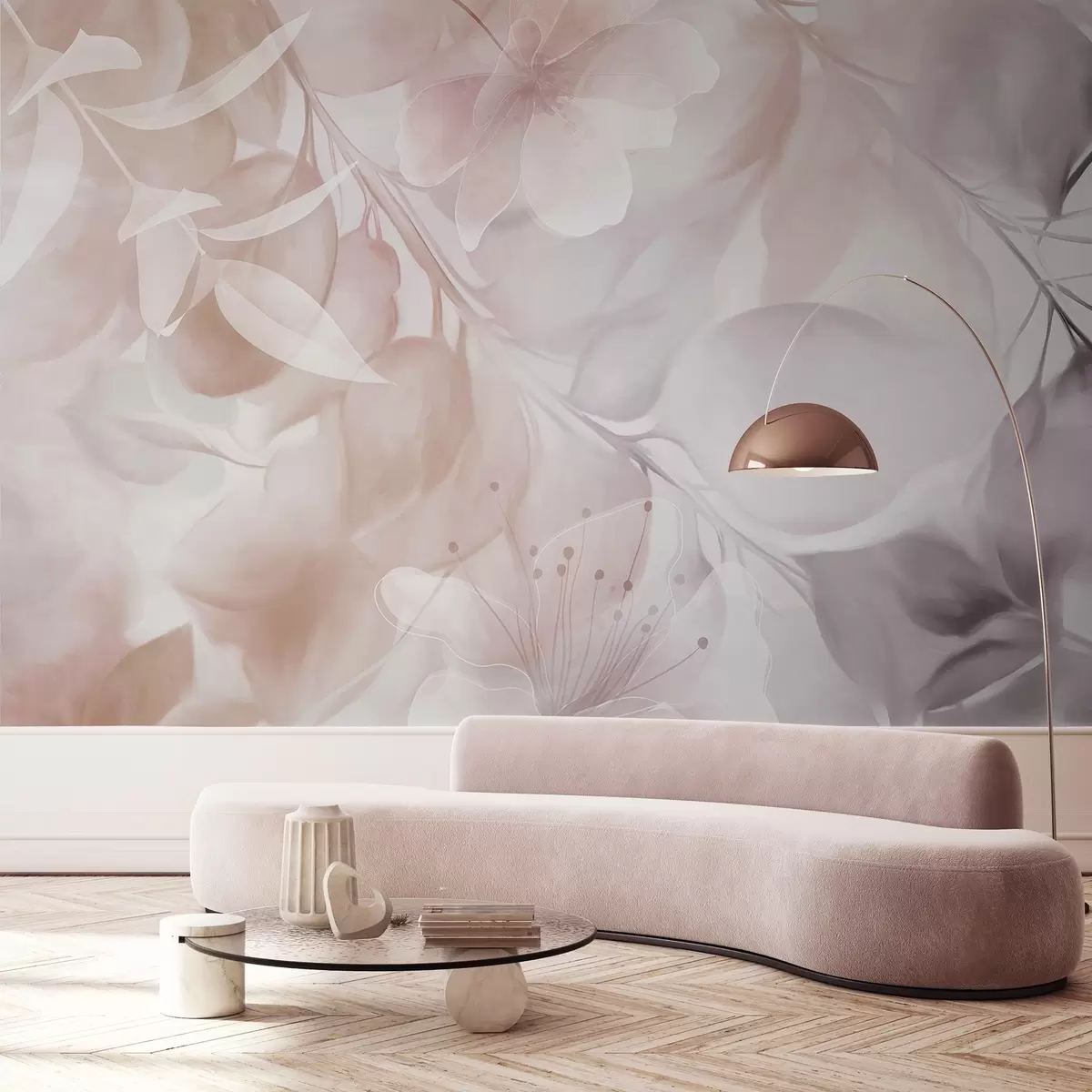 Fototapeten Blumenkunst mit gedeckten beige- und braunen Blumen, Blättern und Zweigen, sanften Pastellfarben und Aquarell-Struktureffekt N° w09397