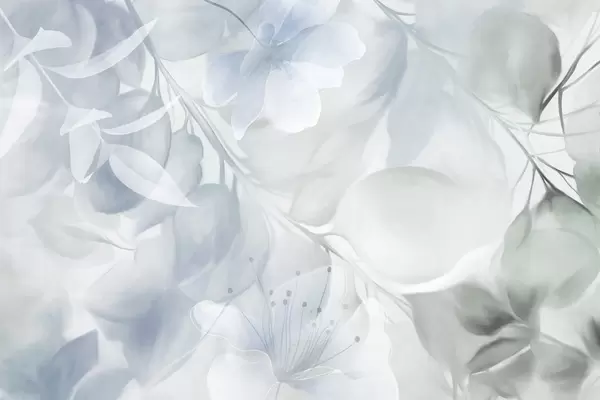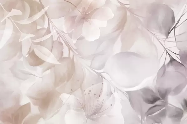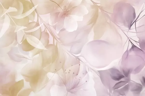 Fototapeten Blumenkunst mit gedeckten gelben und violetten Blüten, Blättern und Zweigen, sanften Pastellfarben und Aquarell-Struktureffekt N° w09397v2