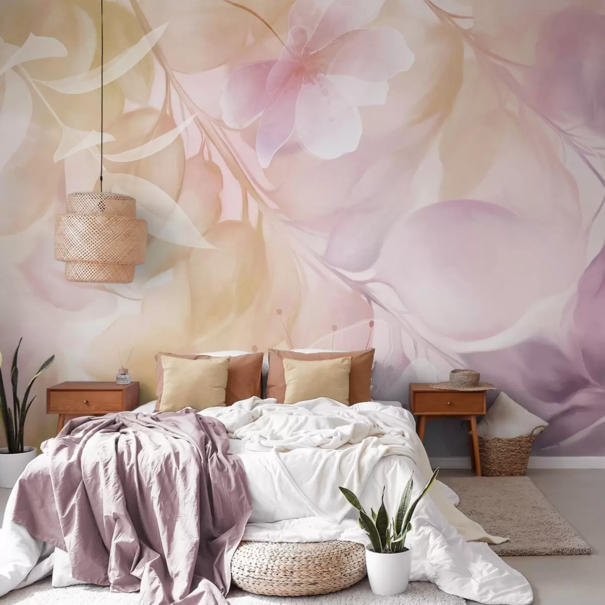 Fototapeten Blumenkunst mit gedeckten gelben und violetten Blüten, Blättern und Zweigen, sanften Pastellfarben und Aquarell-Struktureffekt N° w09397v2
