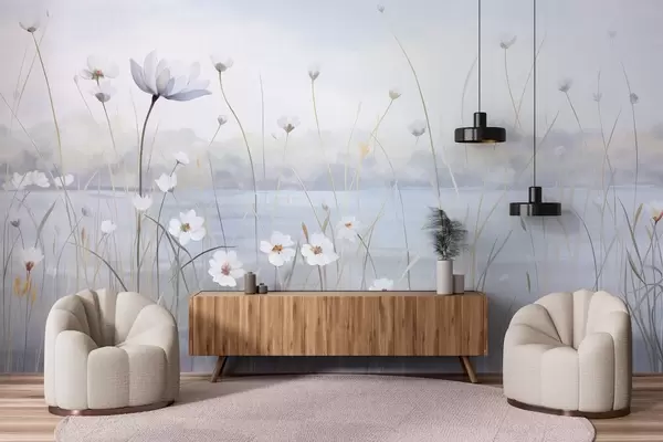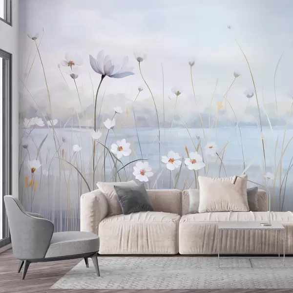 Fototapeten Weiße Blumen mit langen Stielen auf einem Feld, hellblauer Himmel, sanfte Farben, strukturiert, minimalistischer Stil, von der Natur inspiriert, ruhiger Hintergrund N° w09401