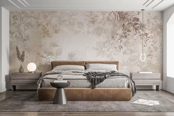 Fototapeten Vintage-Blumenkunst mit strukturierter Oberfläche, zarten Gartenblumen und Blattillustrationen im Zeichenstil, sanften Pastelltönen in Beige und Sepia N° w09402