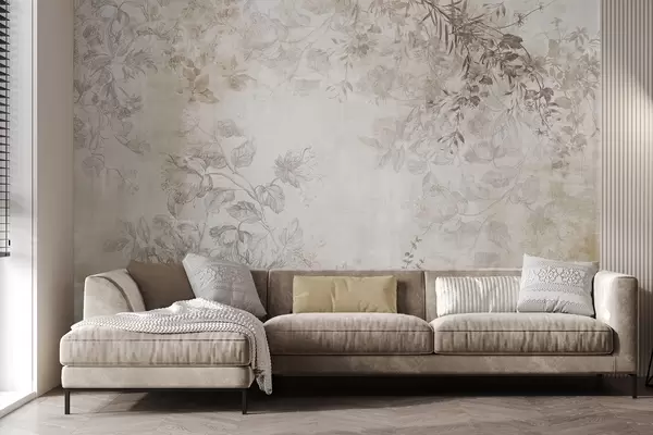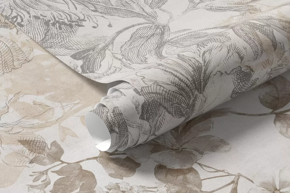 Fototapeten Vintage-Blumenkunst mit strukturierter Oberfläche, zarten Gartenblumen und Blattillustrationen im Zeichenstil, sanften Pastelltönen in Beige und Sepia N° w09402