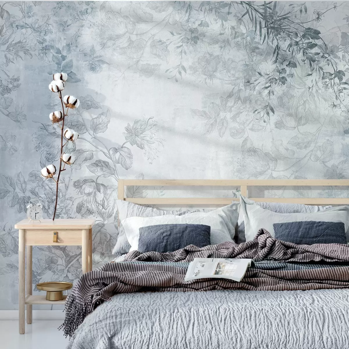 Fototapeten Vintage-Blumenkunst mit strukturierter Textur, Illustrationen von zarten Gartenblumen und Blättern im Zeichenstil, sanfte Blautöne N° w09402v1