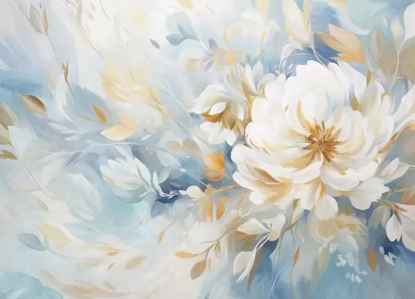 Fototapeten Strukturierte weiße Blume mit blauen und gelben Details und Blättern auf einem blau-weißen abstrakten Hintergrund, Malstil N° w09403