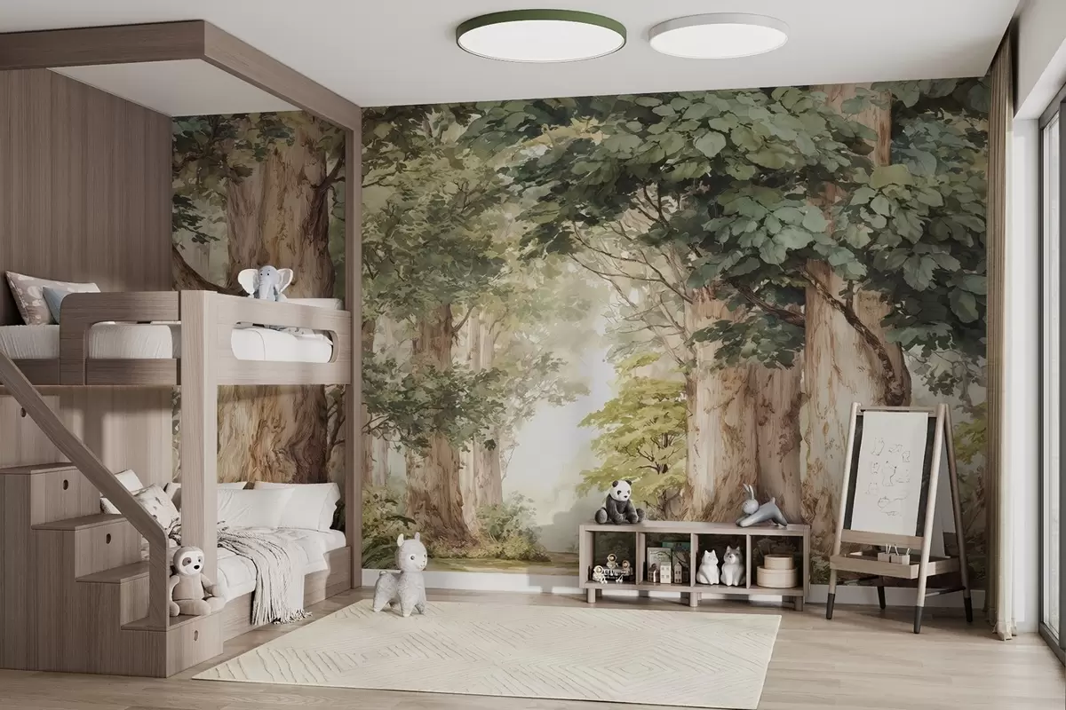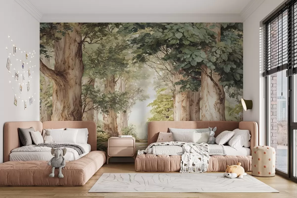Fototapeten Waldweg zwischen majestätischen Bäumen im Aquarellstil N° w09404