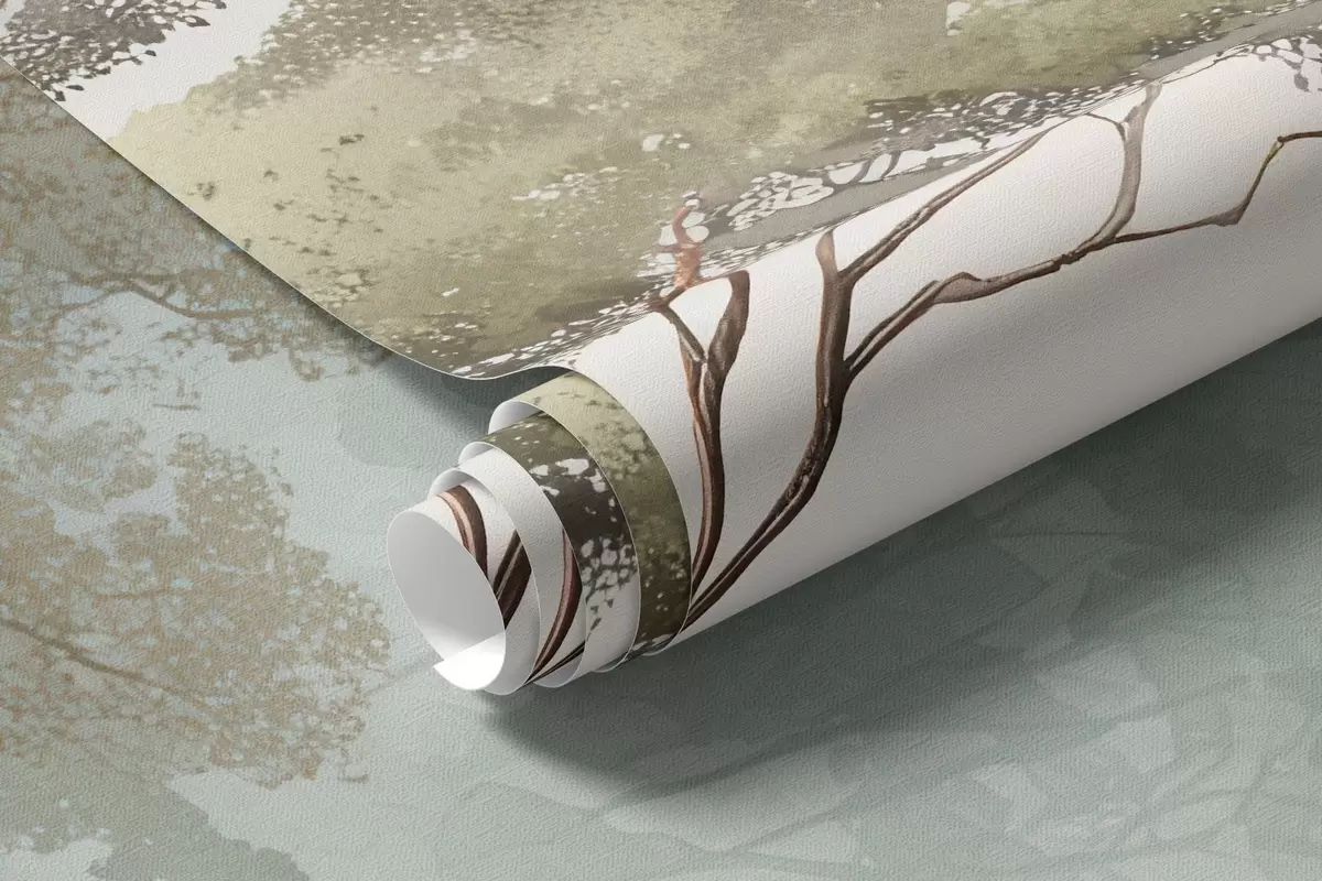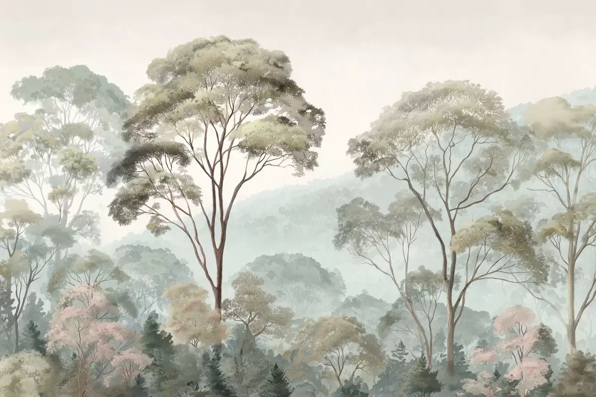 Fototapeten Nebliger Morgen im Wald im Aquarellstil N° w09405