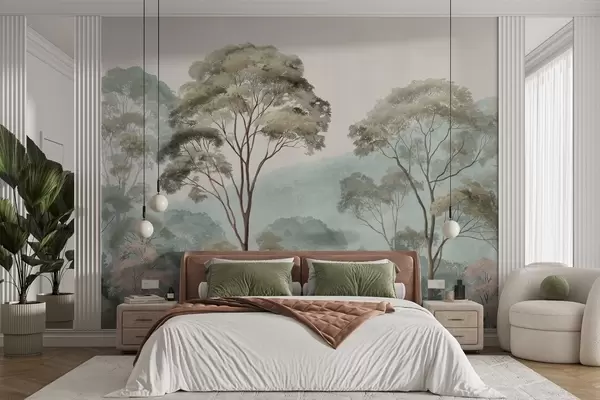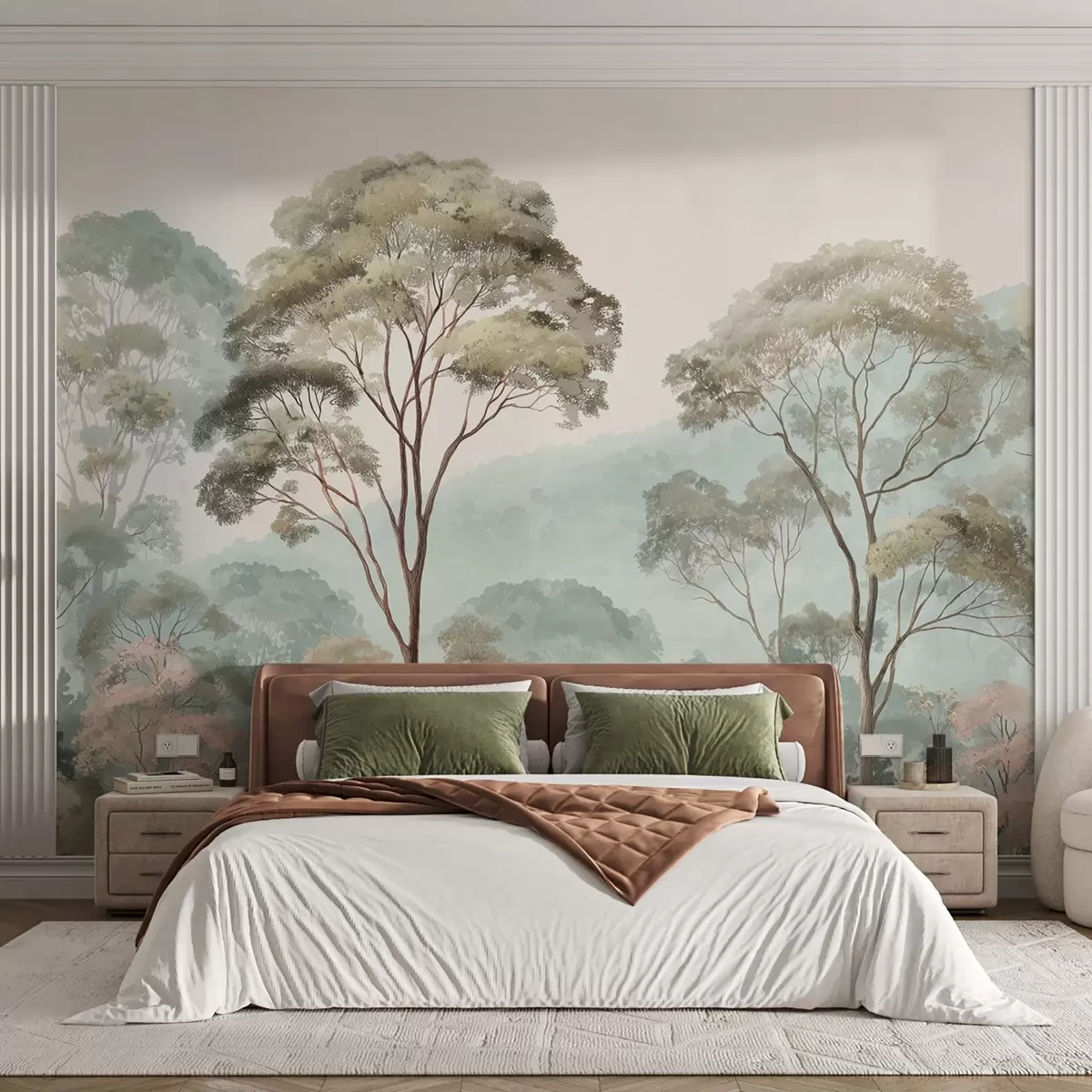 Fototapeten Nebliger Morgen im Wald im Aquarellstil N° w09405