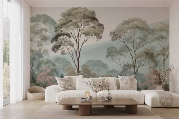 Fototapeten Nebliger Morgen im Wald im Aquarellstil N° w09405