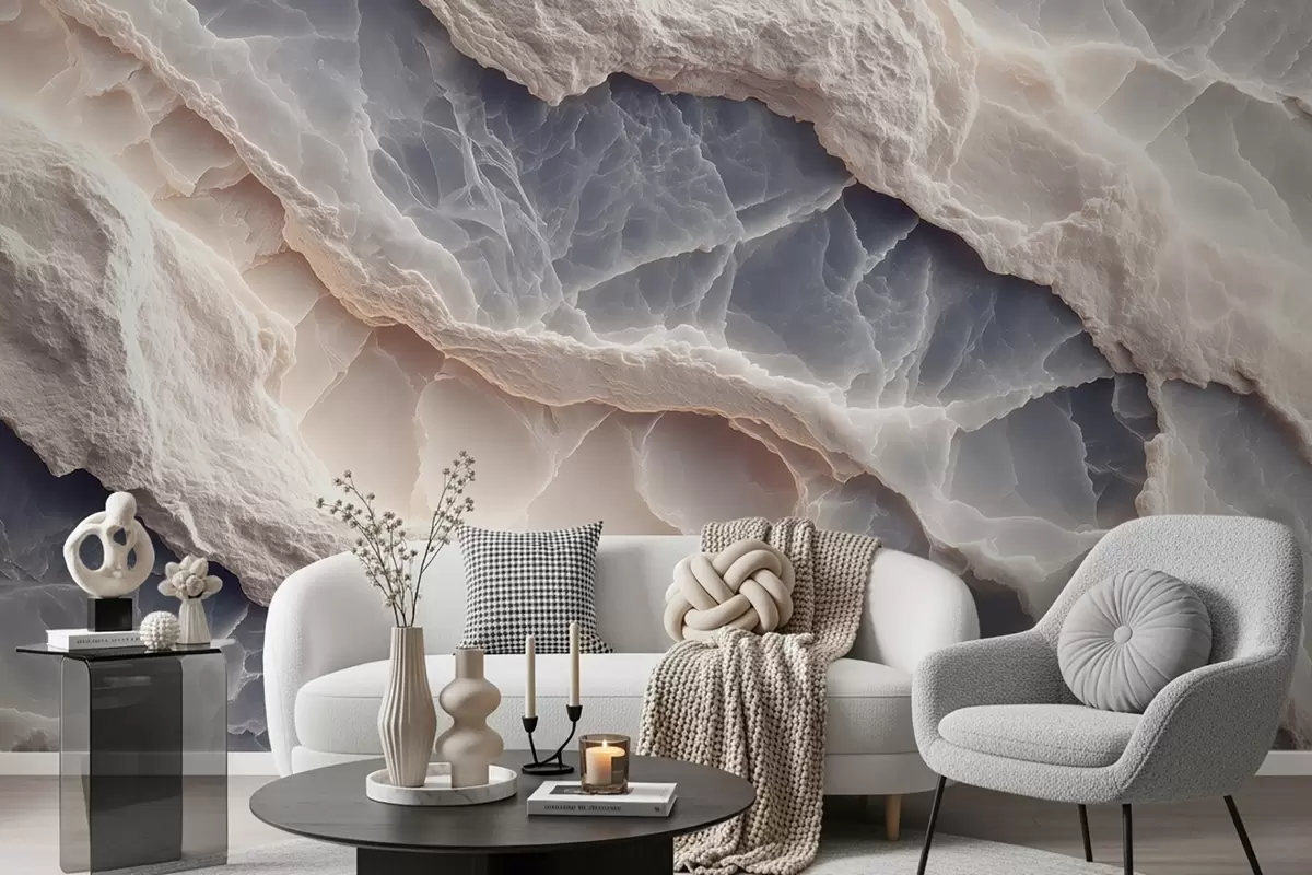 Fototapeten Elegante Abstraktion im Stil von Marmorschichten und Mineralien in blau-beiger Farbe N° w09408