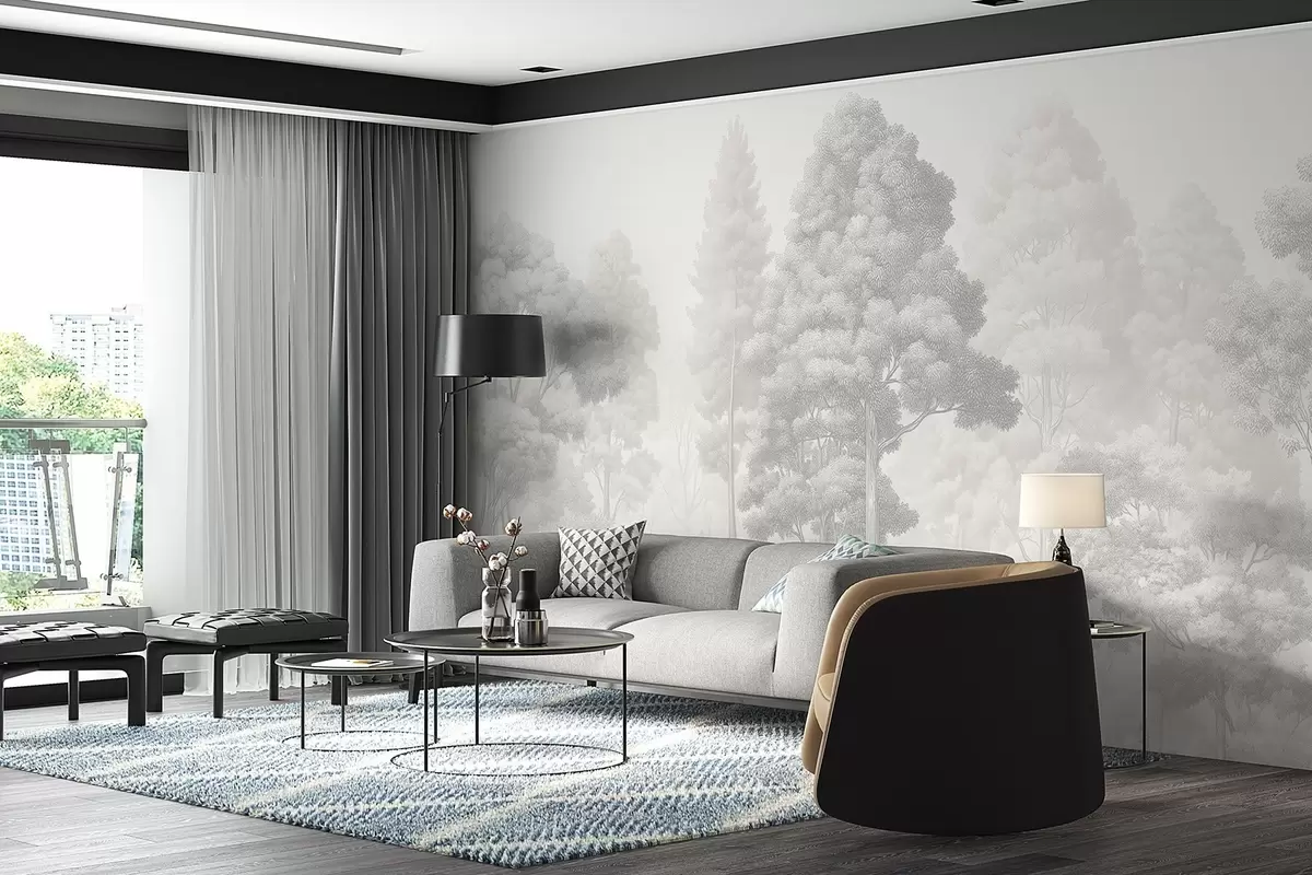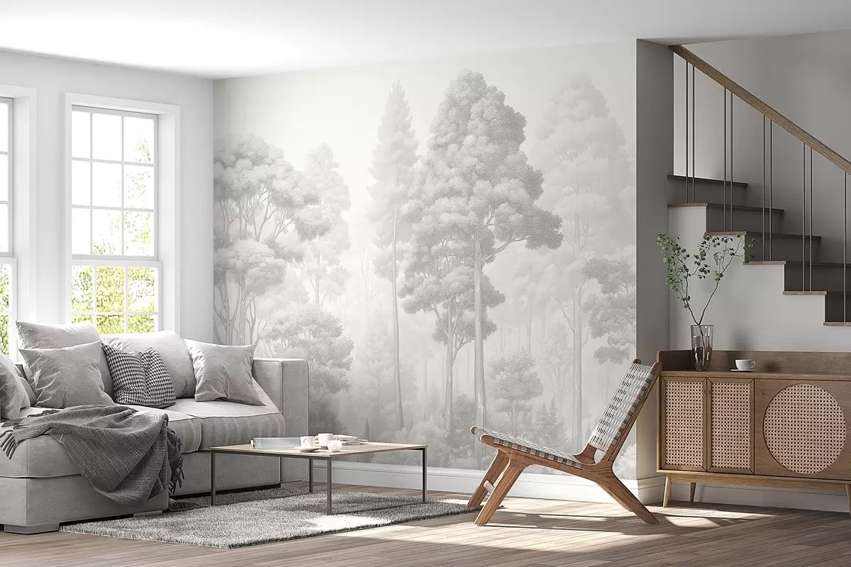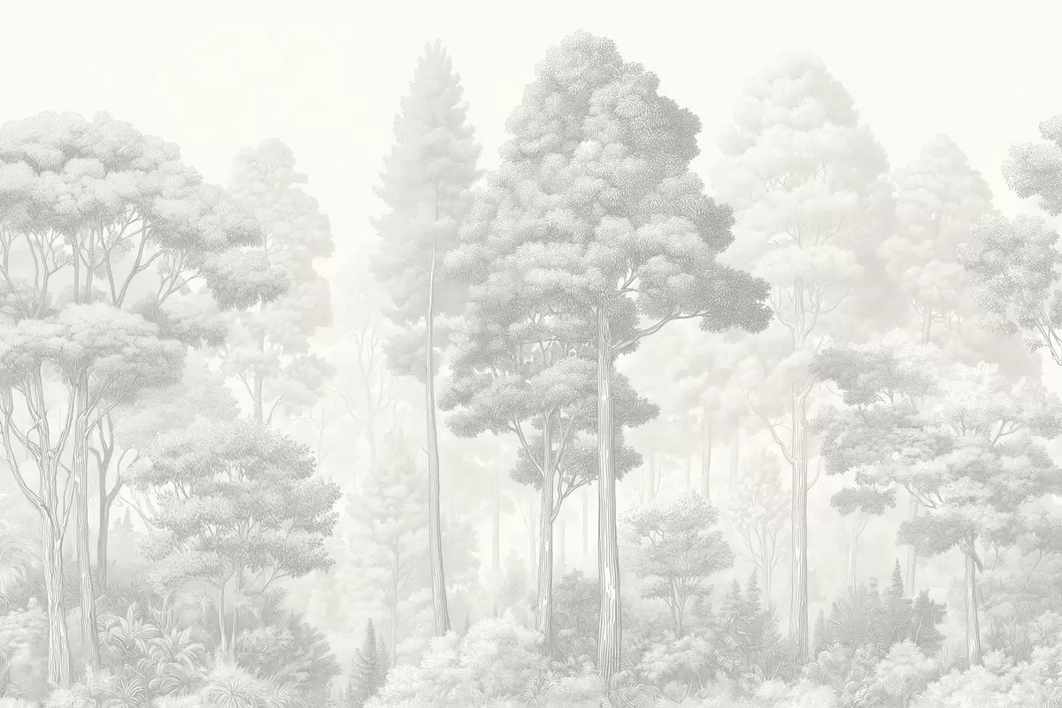 Fototapeten Künstlerische Waldlandschaft in der Technik der schwarz-weißen grafischen Schraffur N° w09411