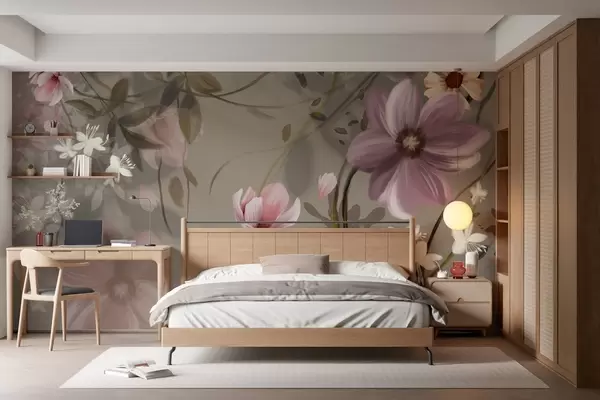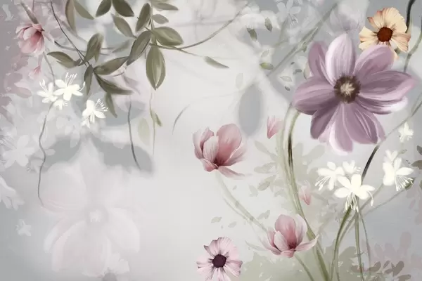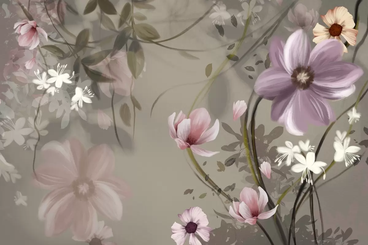 Fototapeten Rosa und weiße Blumen mit braunen Stielen und Blättern, sanfte Beleuchtung, gedämpfte Farben, Blumenarrangement N° w09417